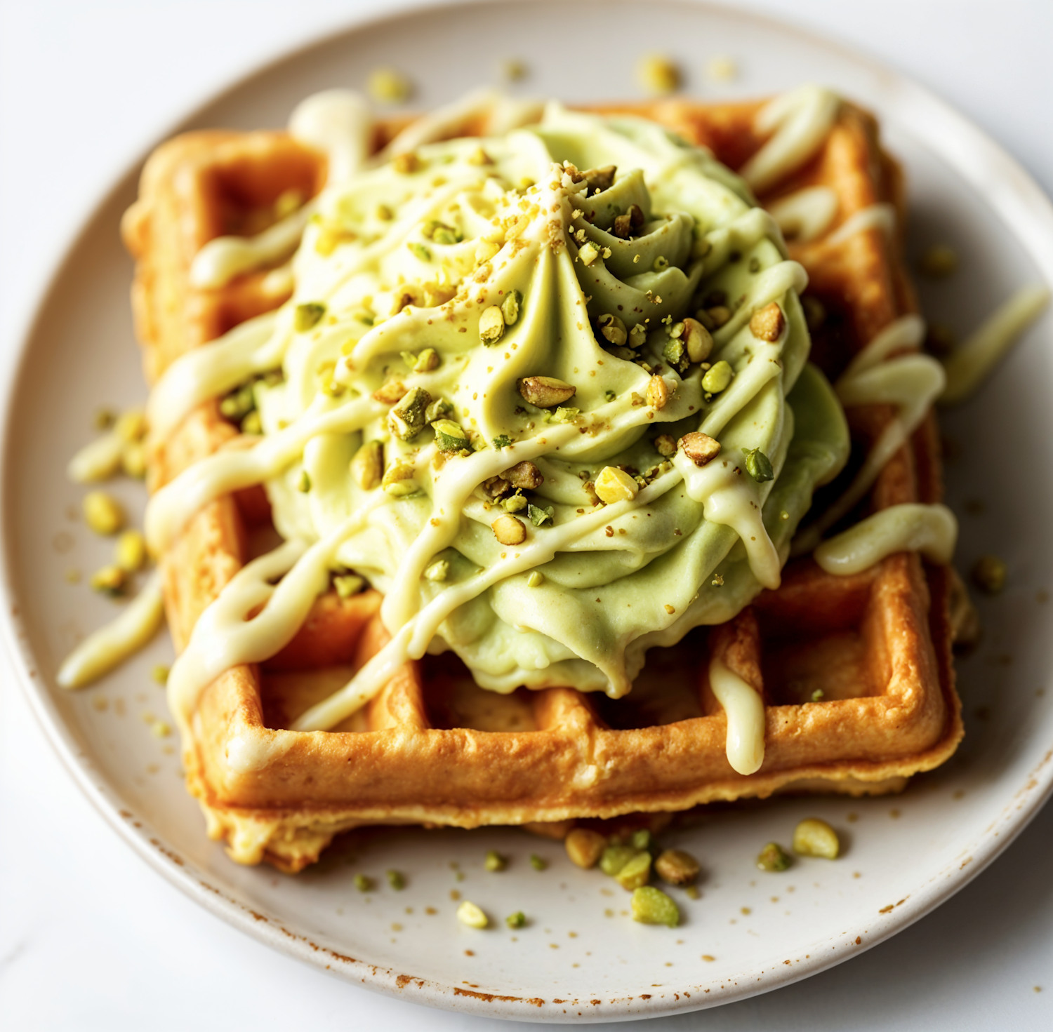 Golden waffle topped with pistachio mousse, crushed pistachios, and white chocolate drizzle on a clean white plate.