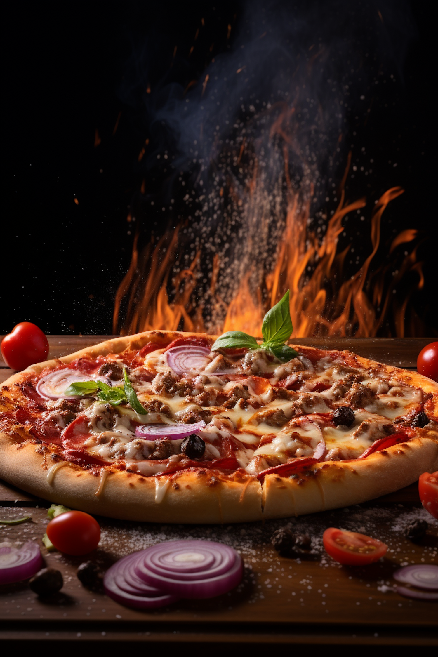 Mouthwatering pizza with cheese, onions, and basil against a fiery backdrop, evoking a wood-fired oven experience.