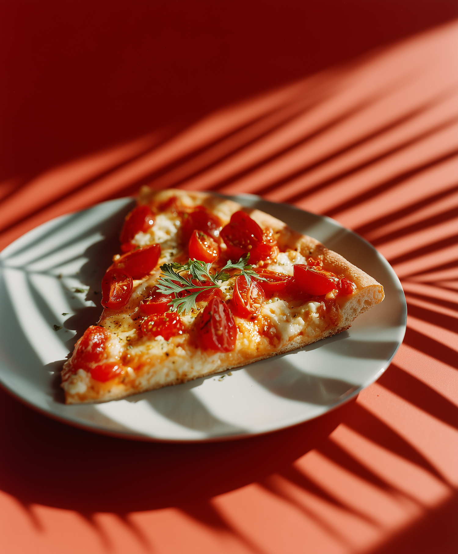 A vibrant slice of pizza with cherry tomatoes and parsley on a white plate, set against a red background with artistic palm leaf shadows.