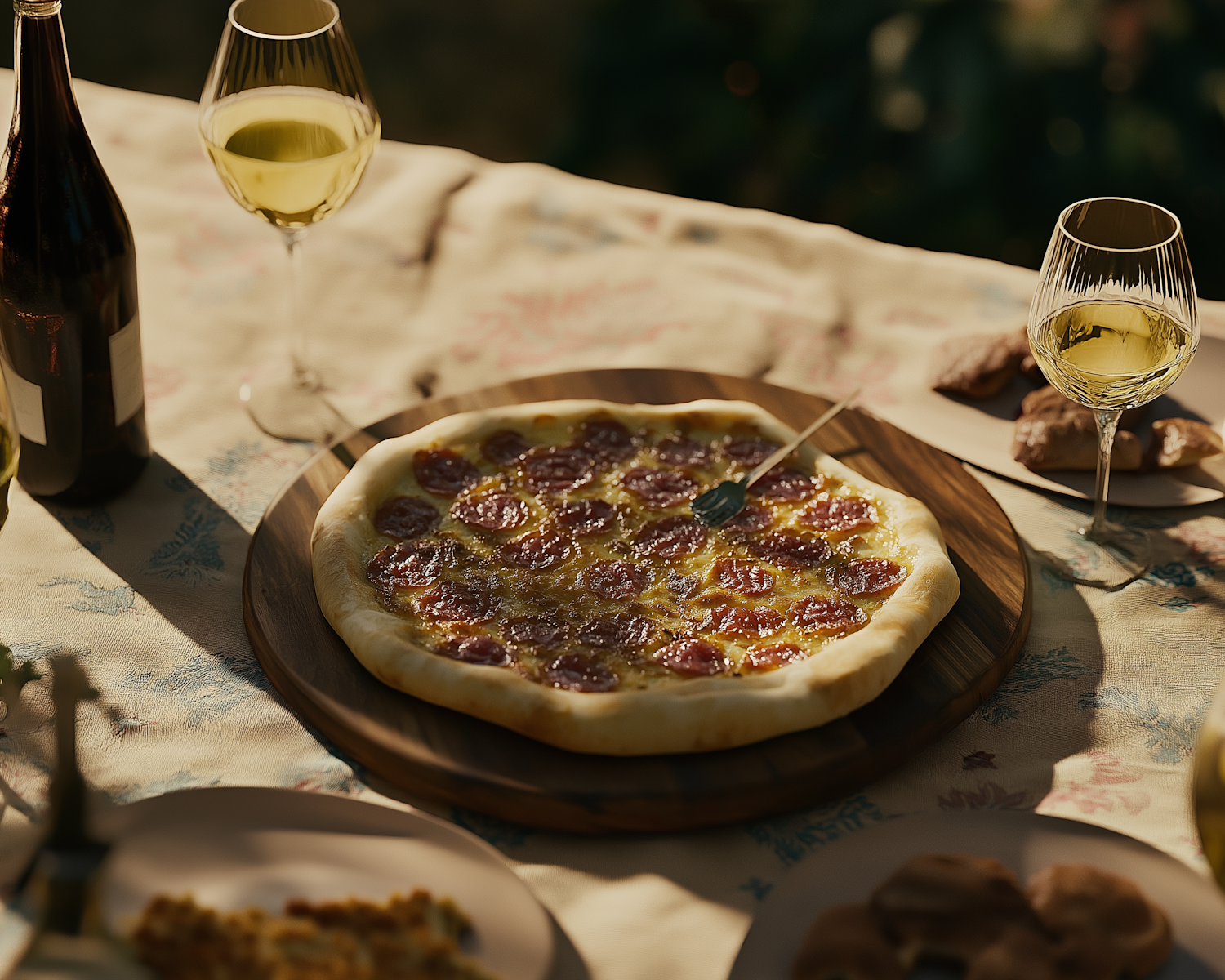 Rustic outdoor table with pepperoni pizza, white wine glasses, and pastries under warm sunlight, evoking a relaxed dining atmosphere.