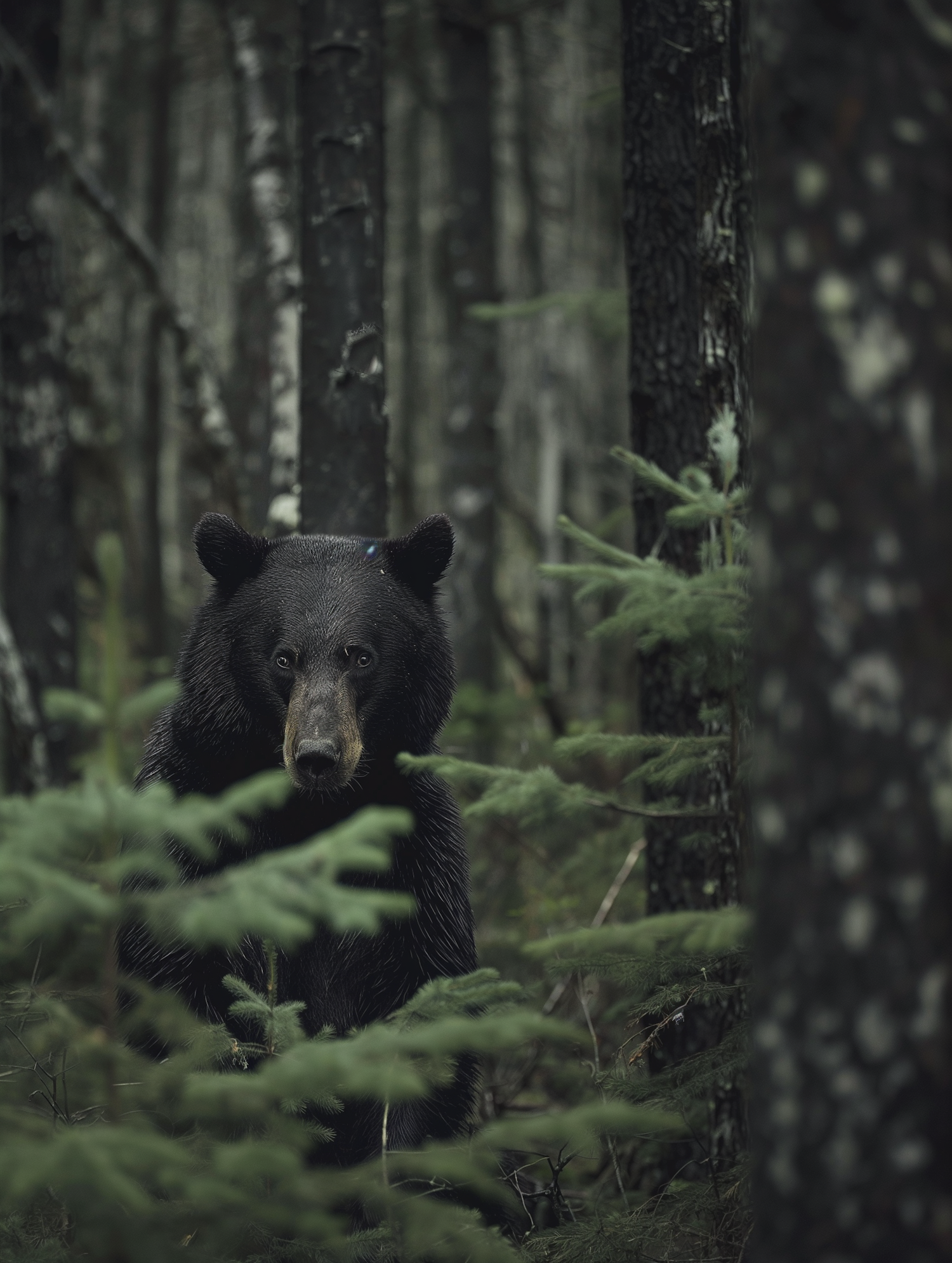 A black bear stands alert in a dense forest, surrounded by tall trees and lush greenery, creating a serene yet tense atmosphere.