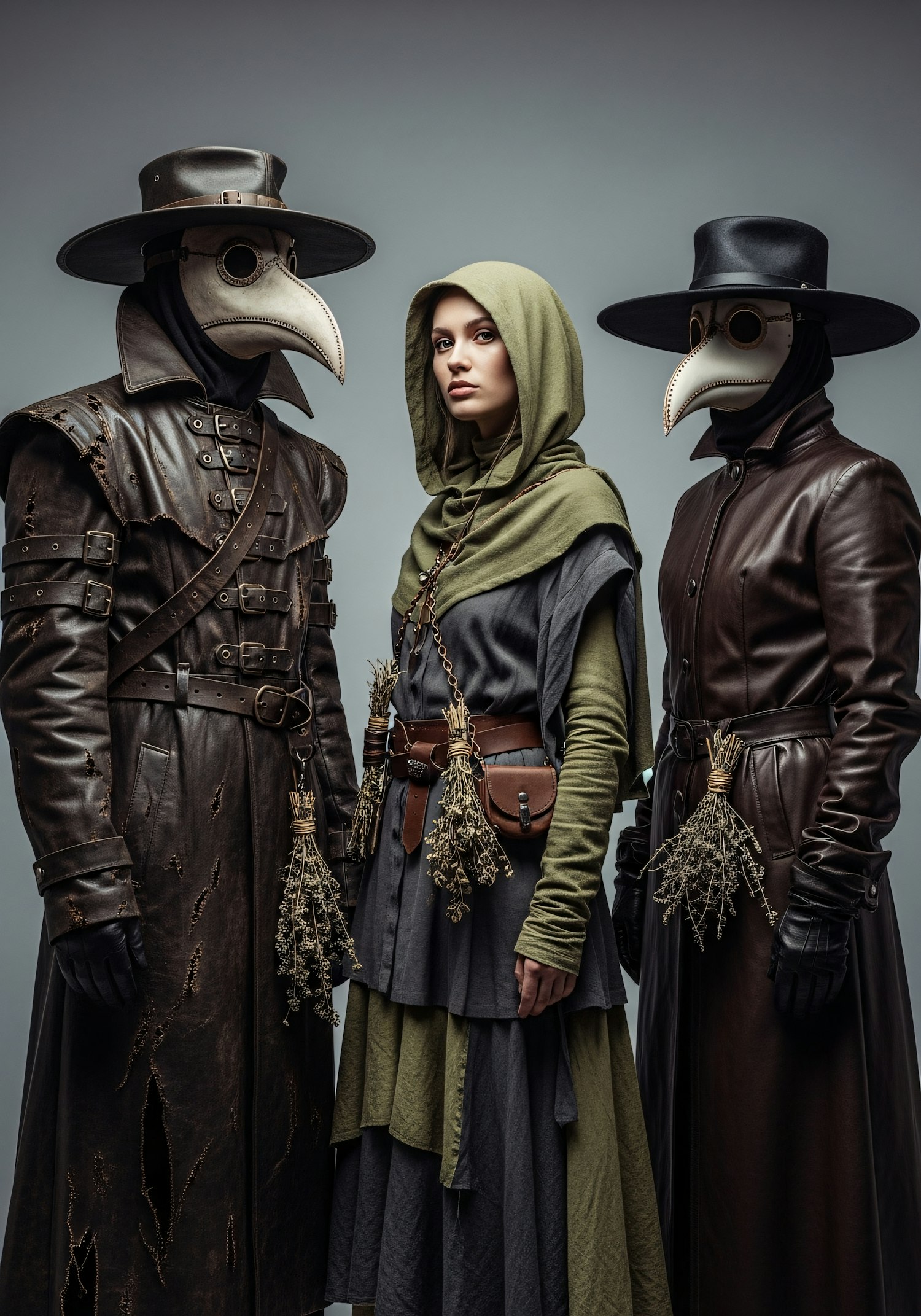 Three individuals in plague doctor attire and medieval-inspired clothing, featuring detailed costumes and herbal accessories.