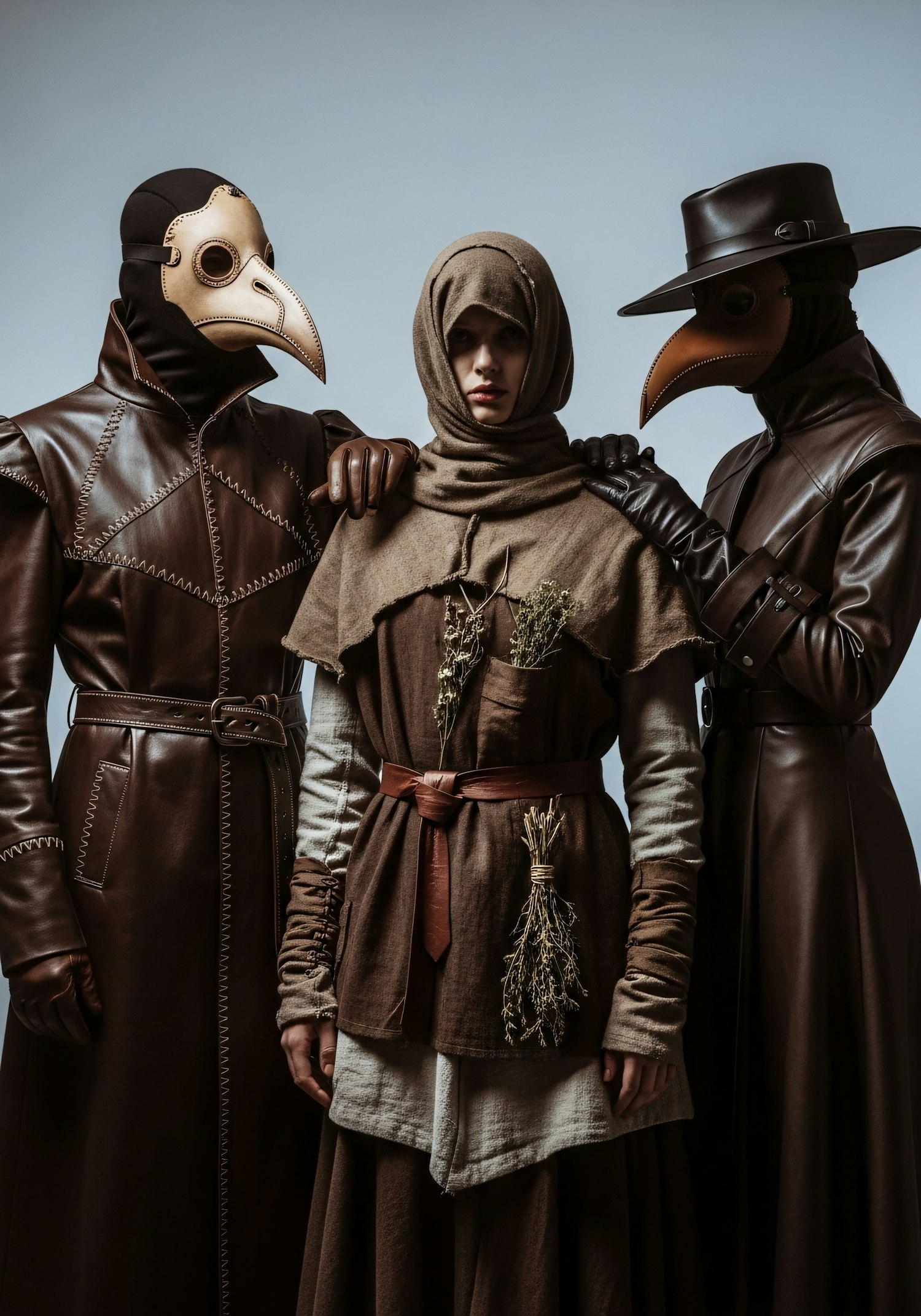 Three individuals in historical costumes, including plague doctor masks and herbalist attire, set against a neutral background.