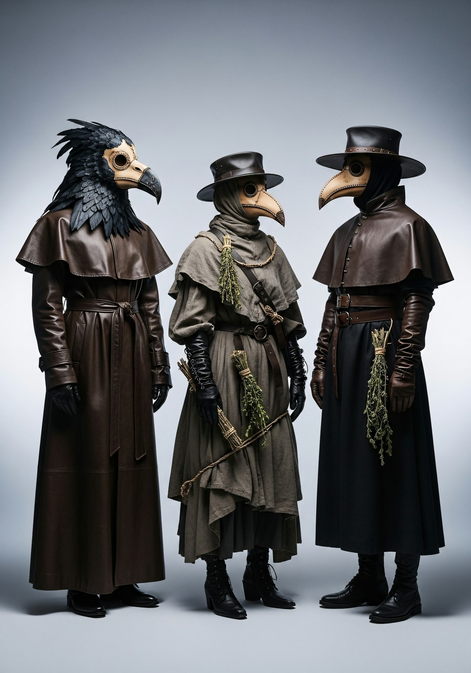 Three individuals in detailed plague doctor costumes with bird-like masks and cloaks, standing against a neutral background.