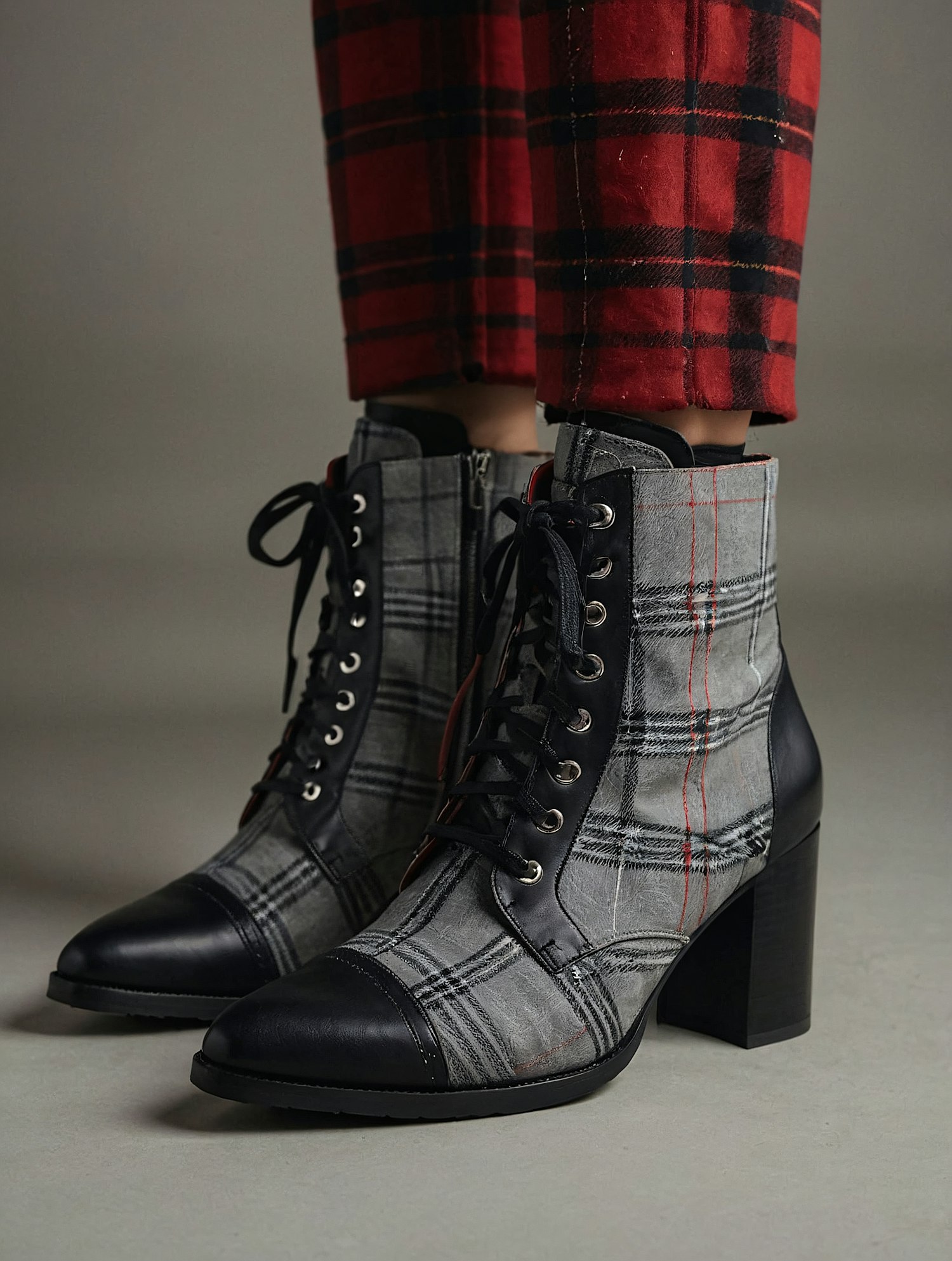 Chic plaid lace-up ankle boots with black leather accents and block heels, paired with red plaid pants for a bold, stylish look.
