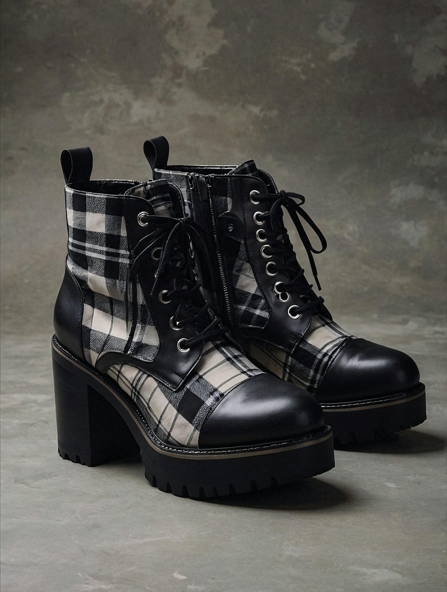Trendy black and white plaid combat boots with chunky block heels, rugged soles, and sleek black leather accents for a bold, edgy look.