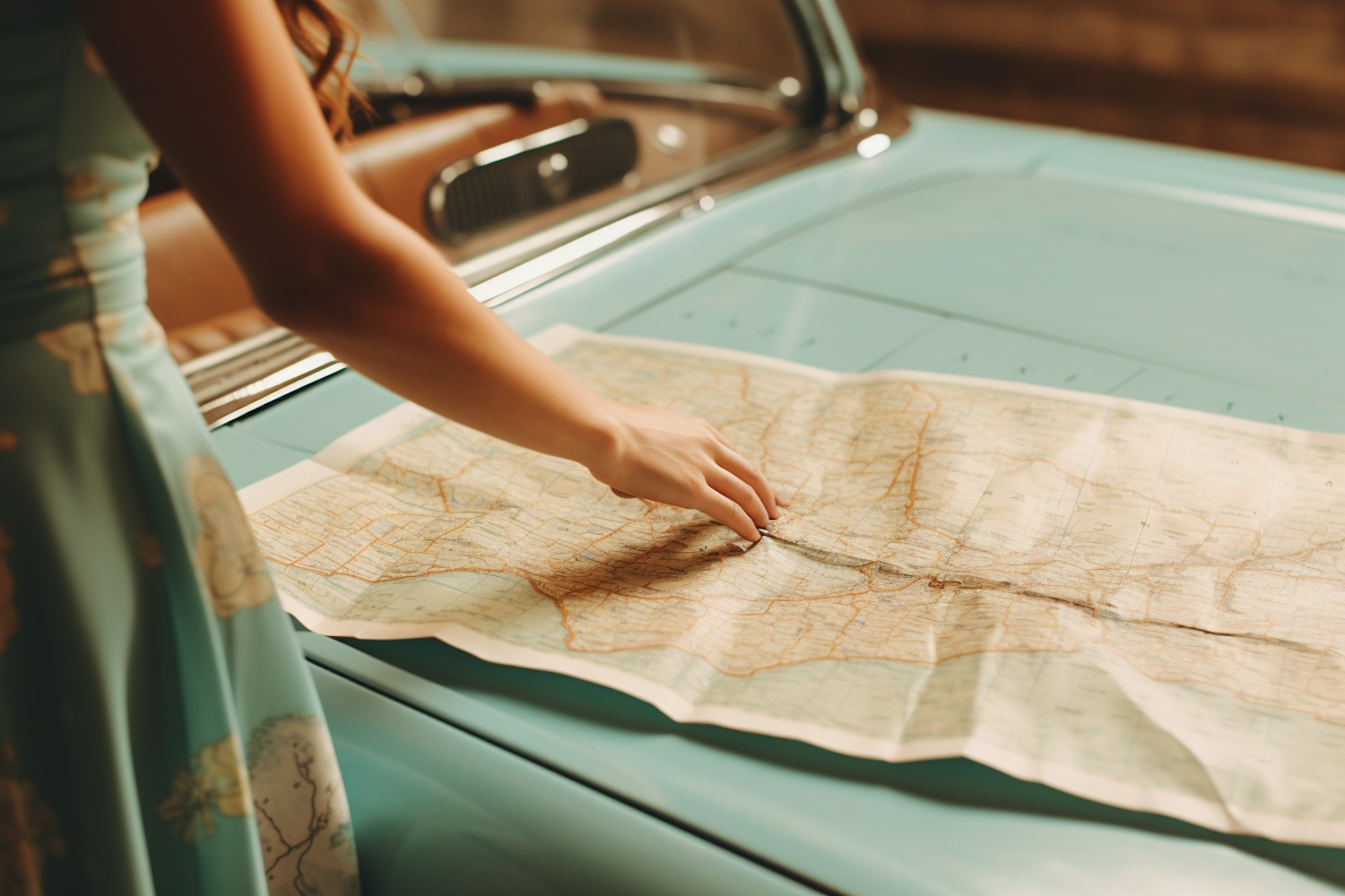 Woman in a floral dress examines a map on a vintage turquoise car, evoking a nostalgic road trip vibe.