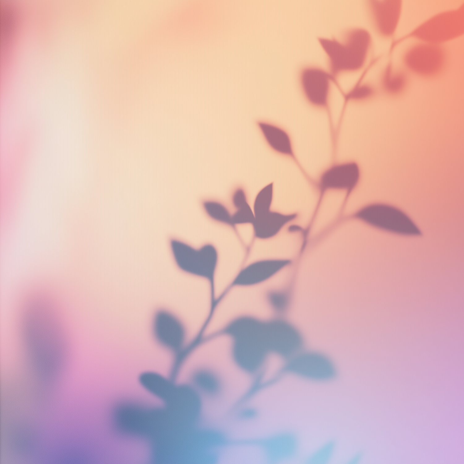 Blurred plant shadow on a dreamy gradient background of peach, pink, and lavender tones, creating a serene and minimalistic vibe.