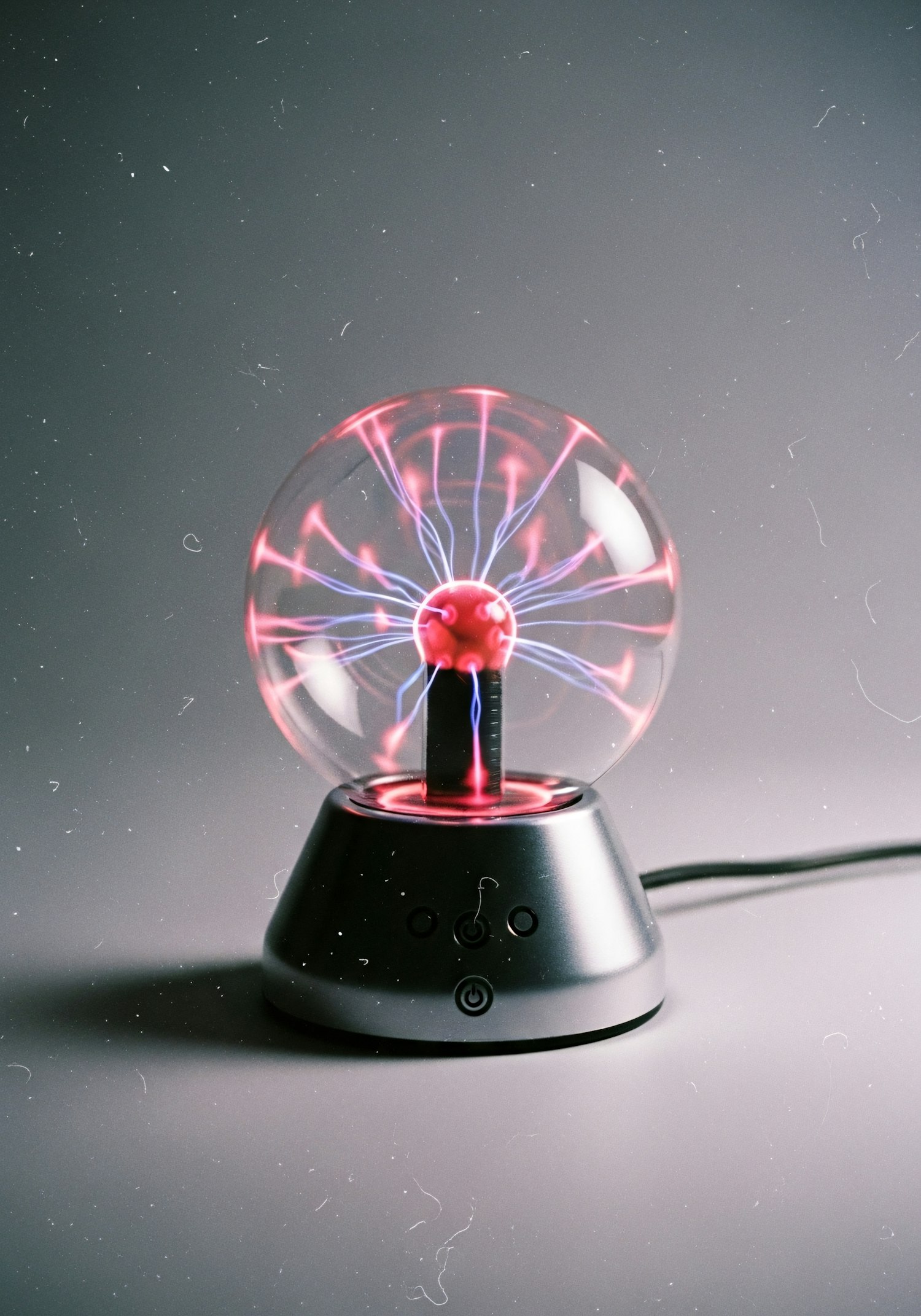 A glowing plasma globe with pink and blue electric arcs on a metallic base, set against a neutral background.
