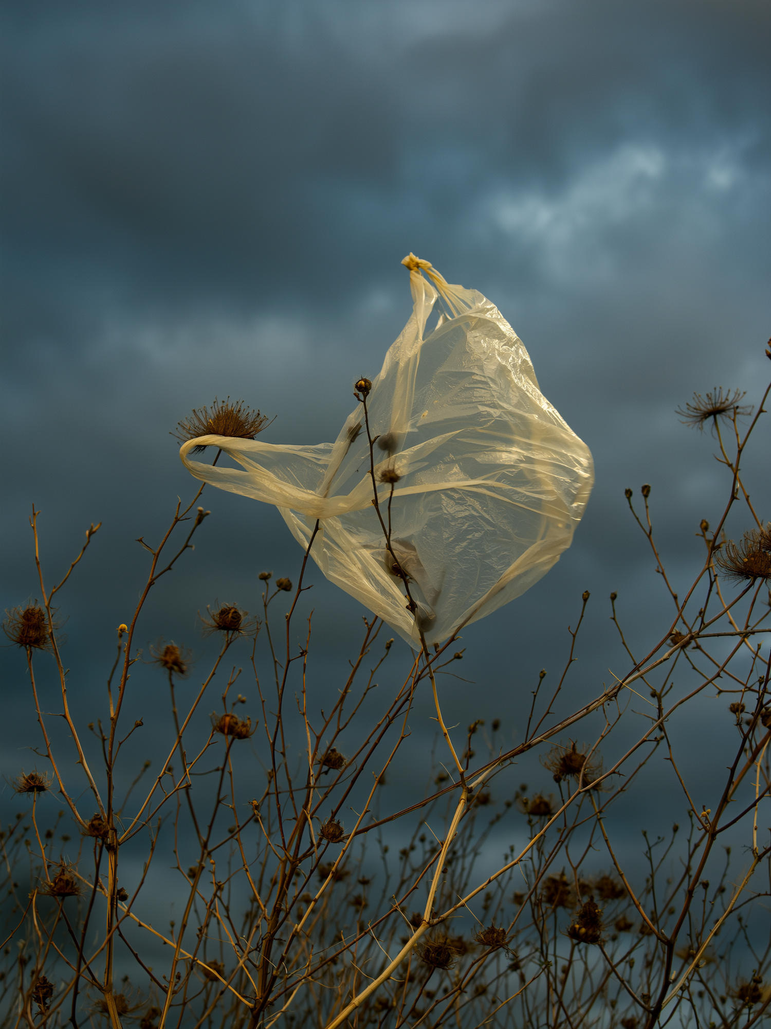 A plastic bag tangled in dry branches under a dramatic cloudy sky, highlighting environmental pollution and nature's resilience.
