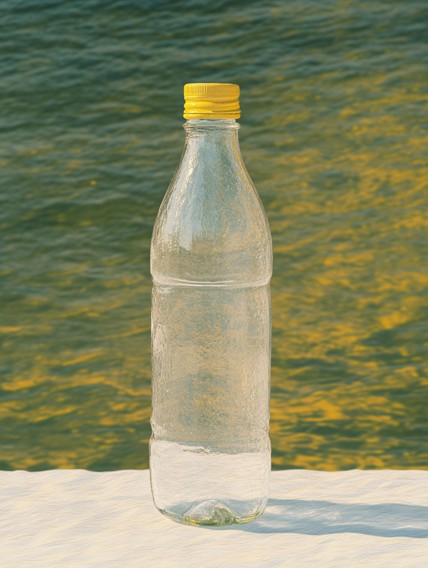 Clear plastic bottle with yellow cap on white surface, set against a blurred water background with green and yellow hues.