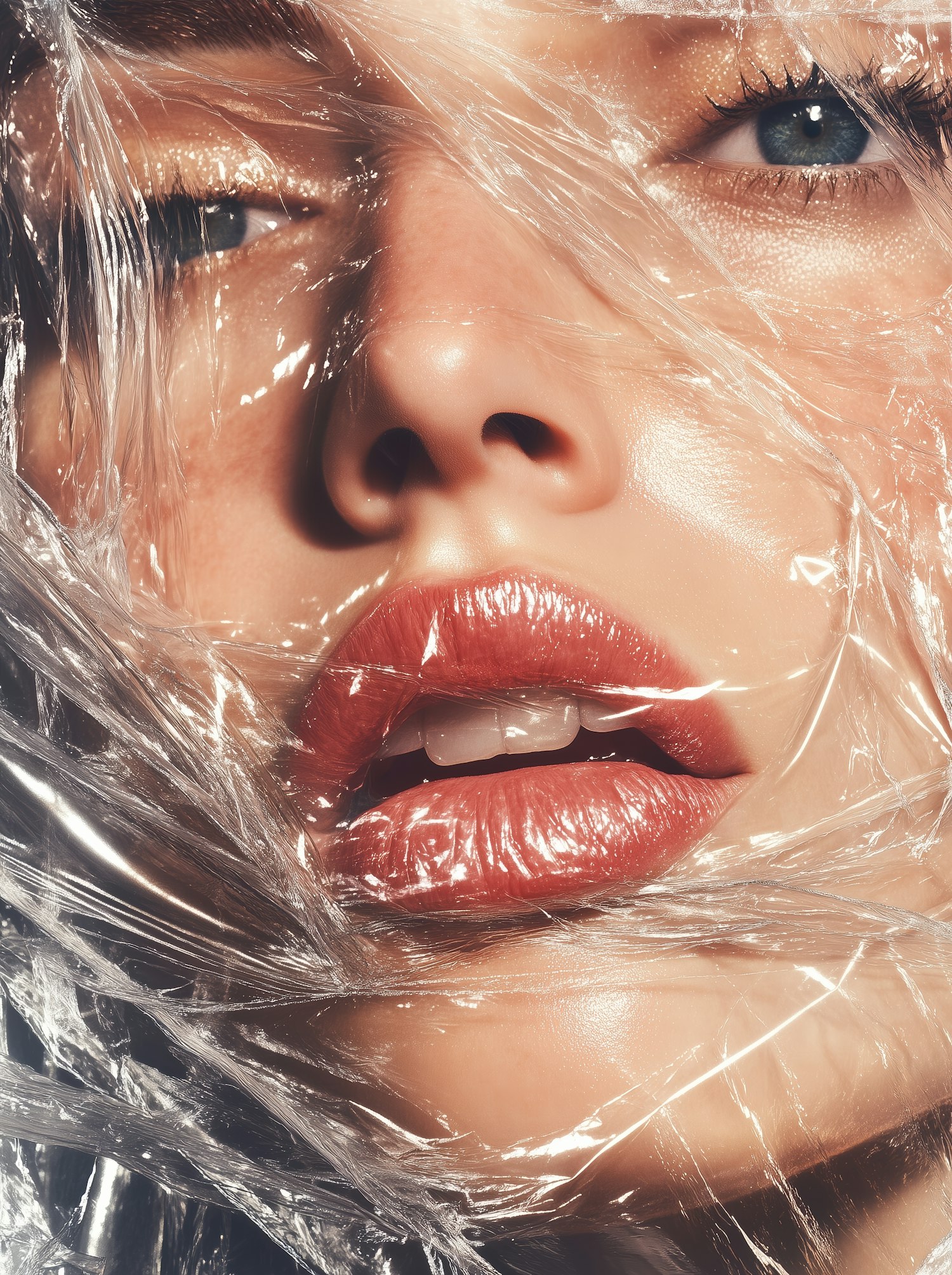 Close-up of a face with glossy lips and expressive eyes, partially covered by transparent plastic, creating a dramatic visual effect.