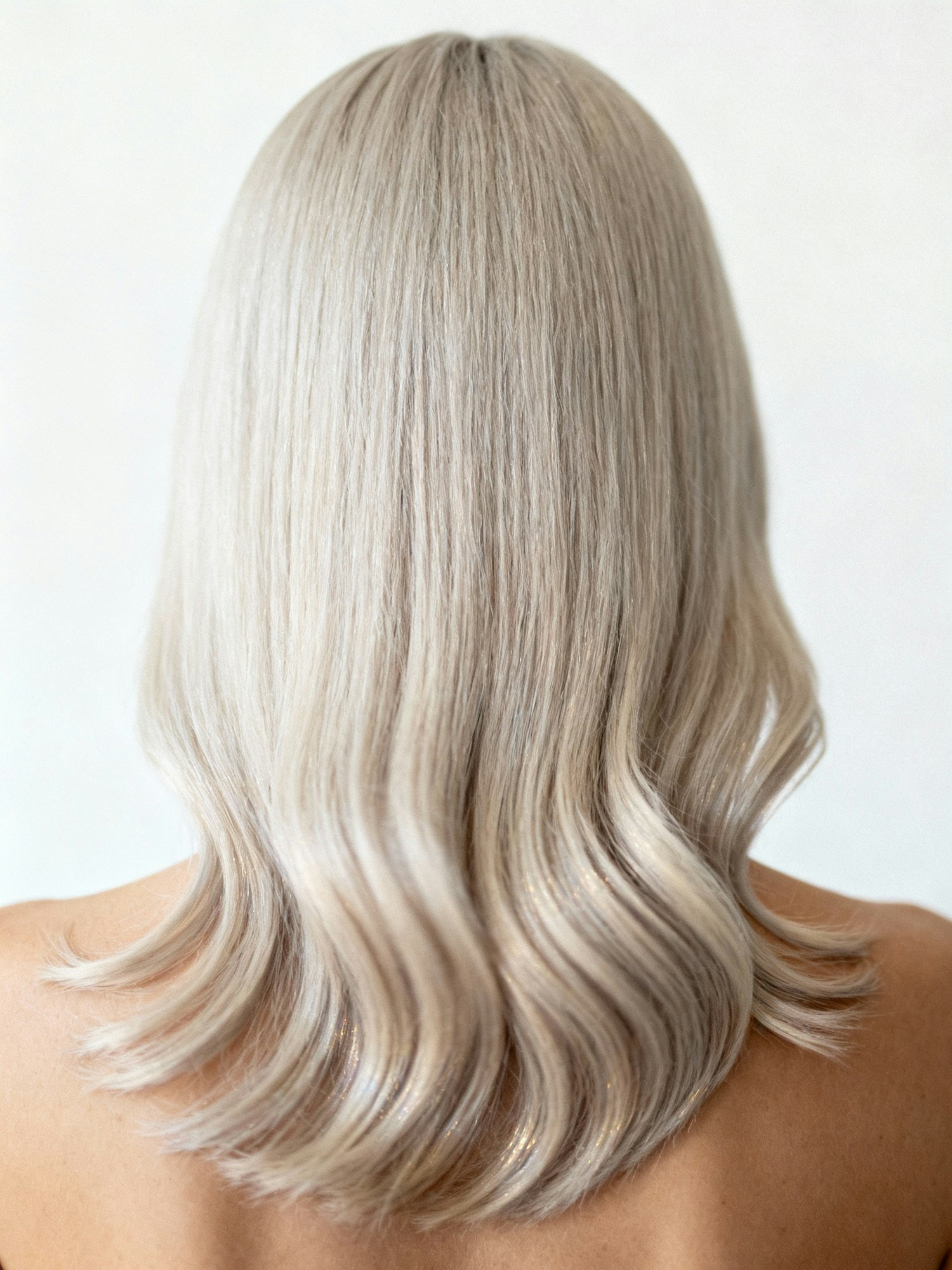 A back view of a person with wavy, platinum blonde hair, showcasing its smooth texture and healthy shine against a neutral background.
