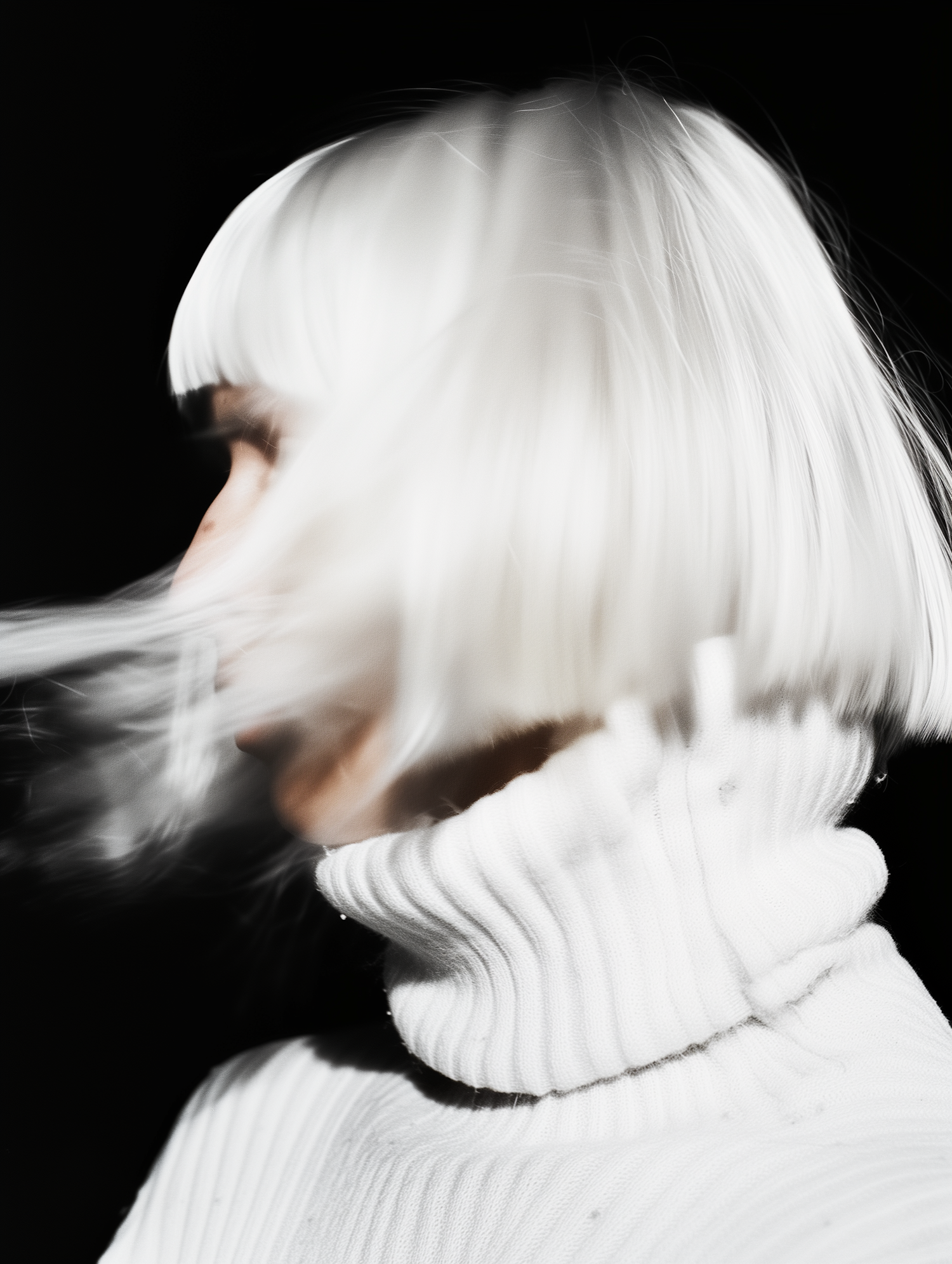 Dynamic close-up of a platinum blonde bob in motion, paired with a white ribbed turtleneck against a dark background.