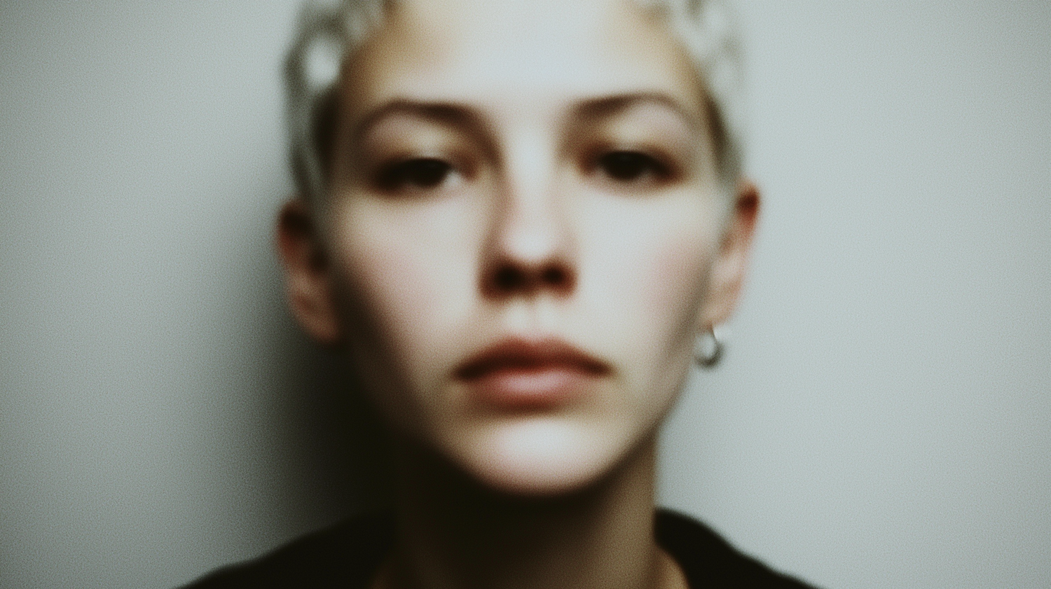 Blurred close-up of a person with short platinum blonde hair, light skin, and a neutral expression against a plain background.