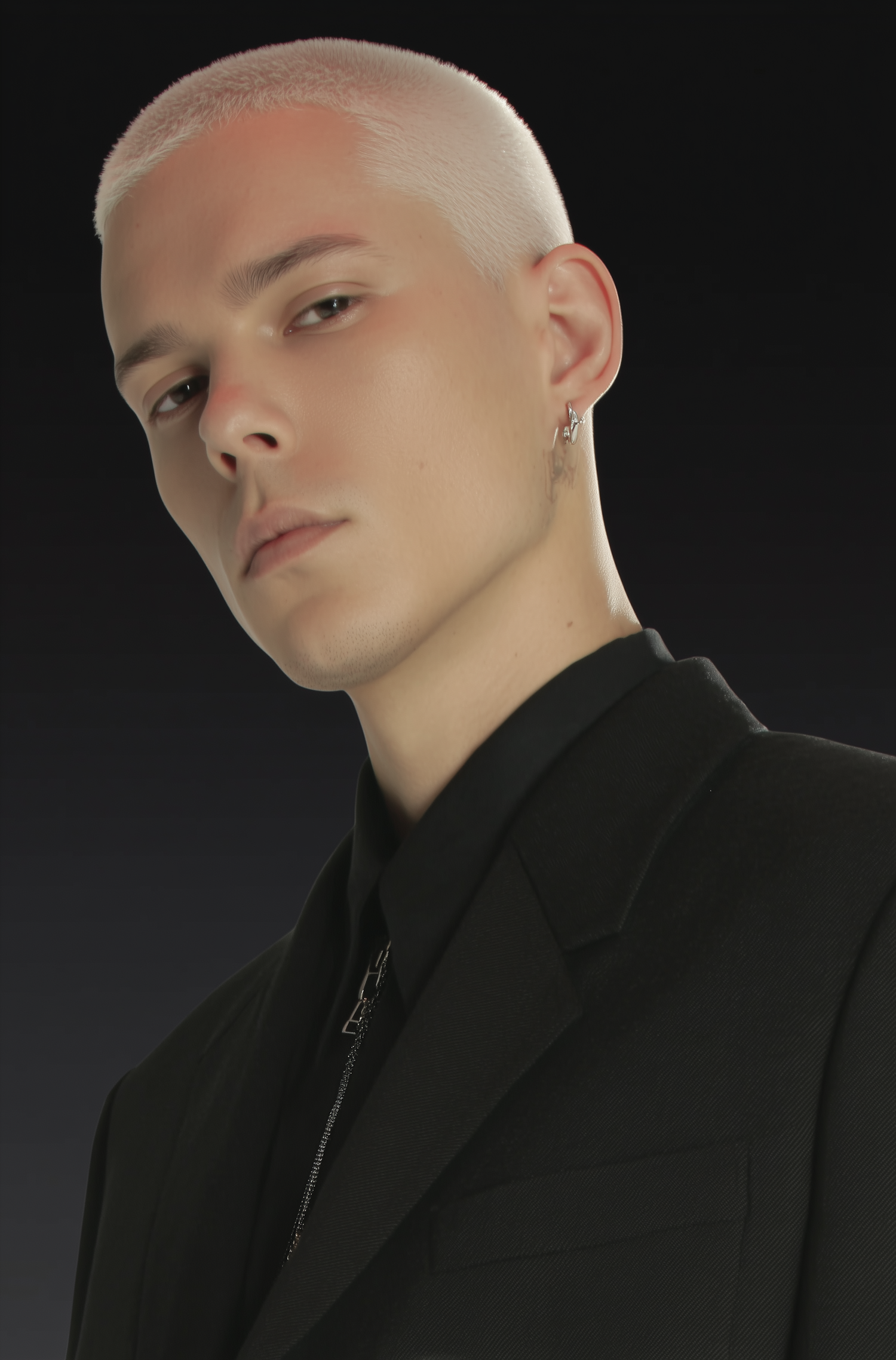 Close-up portrait of a person with platinum blonde hair, wearing a black suit and silver accessories, set against a dark gradient background.