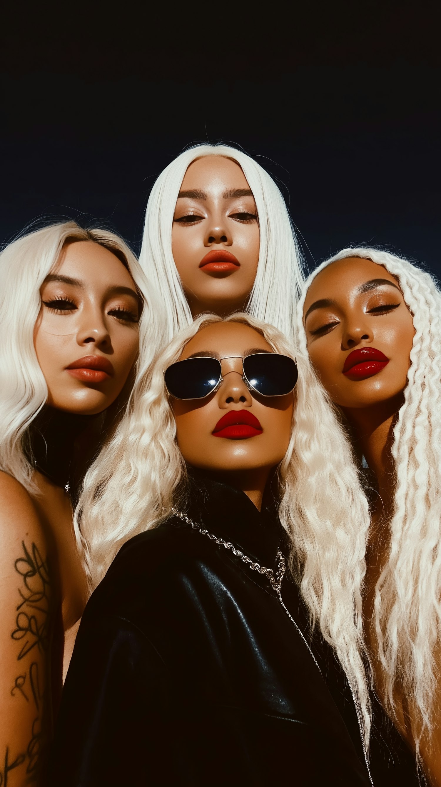 Four individuals with platinum blonde hair and bold red lipstick pose together against a dark background, showcasing a modern and edgy style.