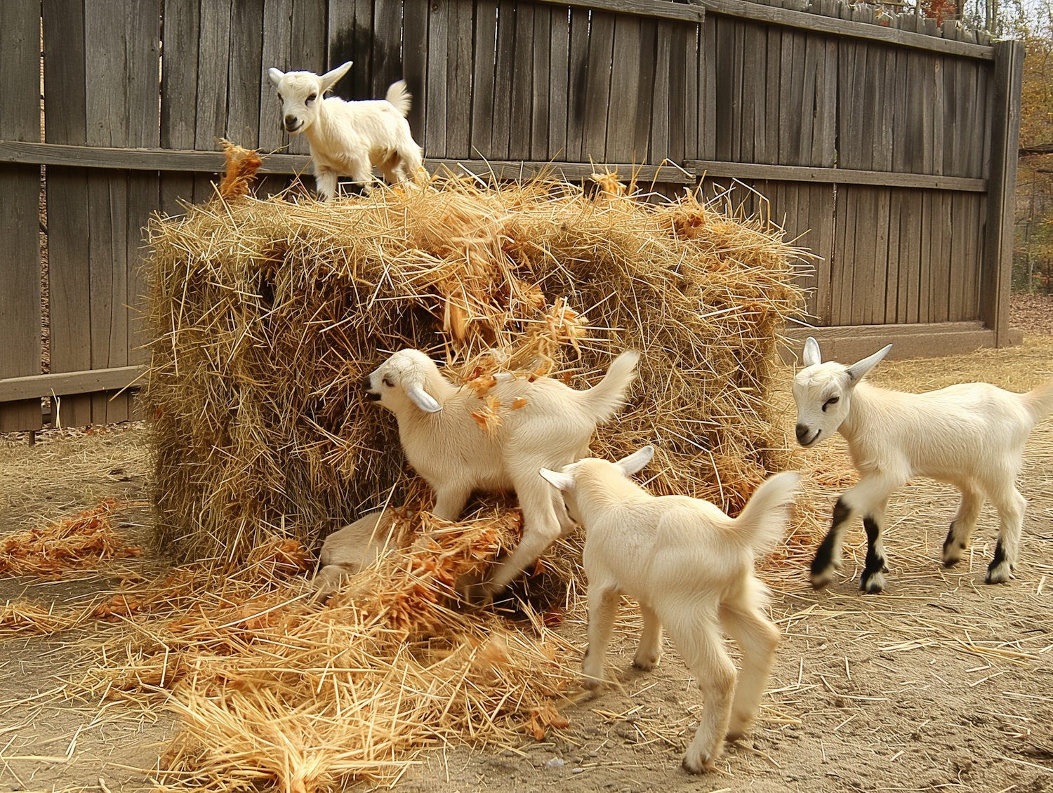 Adorable young goats playing around a hay bale in a sunny outdoor enclosure, showcasing their playful and curious nature.