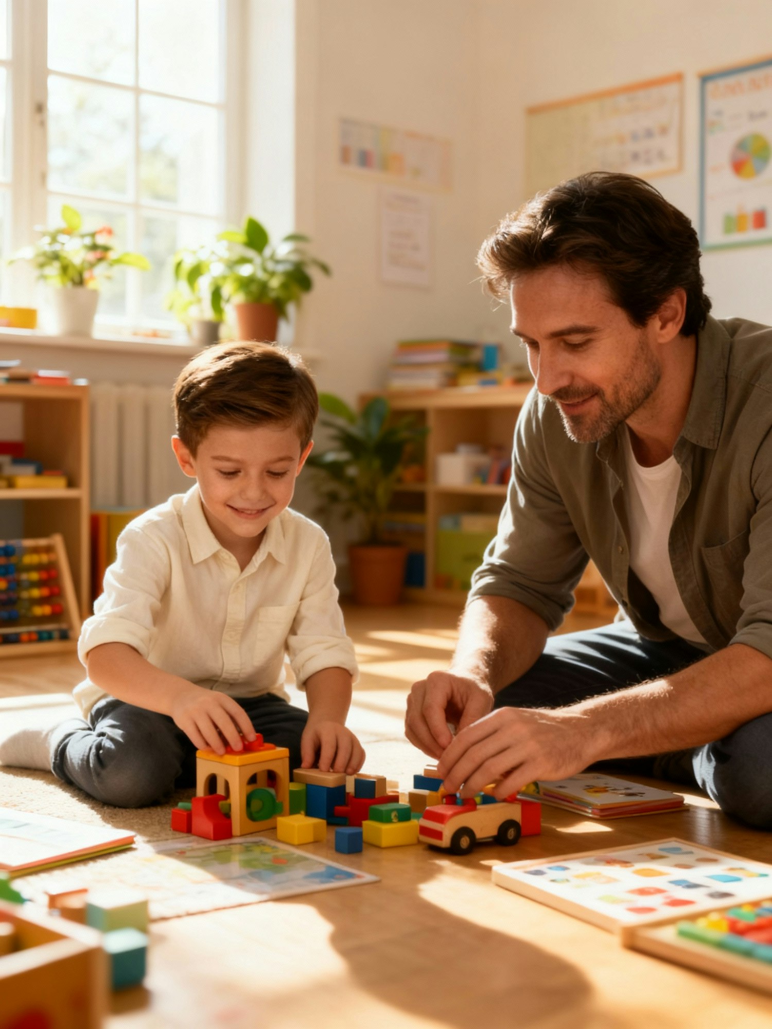 A father and son enjoy building with colorful blocks in a sunlit room, surrounded by books and plants, creating a warm and joyful scene.