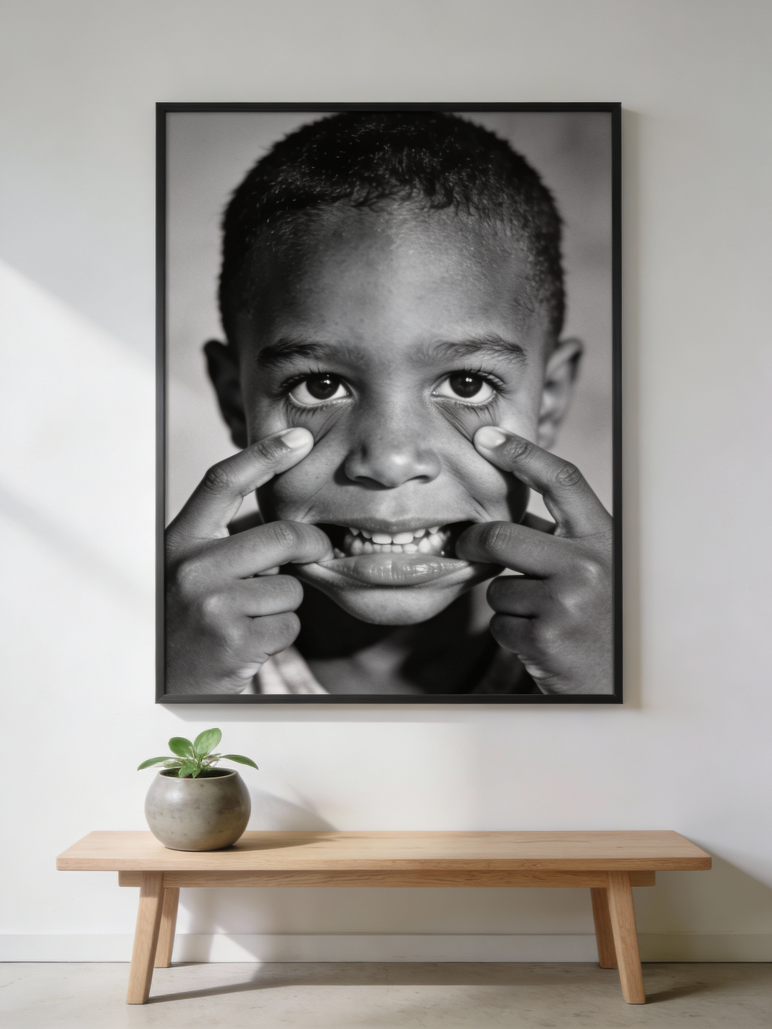 A Scandinavian-inspired interior wall with a single framed A young Black child with short hair pulls down the skin below both eyes and the corners of the mouth with their fingers, creating a distorted, exaggerated facial expression. The close-up portrait is rendered in black and white, emphasizing tonal contrast and the raw texture of skin and gesture. The background is softly blurred, keeping full focus on the child’s face and the expressive tension of the pose. Lighting is soft and directional, highlighting the contours of the face and the dynamic stretch of the skin. The mood is mischievous, surreal, and emotionally charged—blending childhood playfulness with visual abstraction. Hyperrealistic rendering should emphasize skin texture, finger tension, and grayscale harmony across light and shadow artwork in muted tones. Below it, a light oak bench with a matte ceramic planter. The space is illuminated by soft daylight, highlighting clean lines and balance
