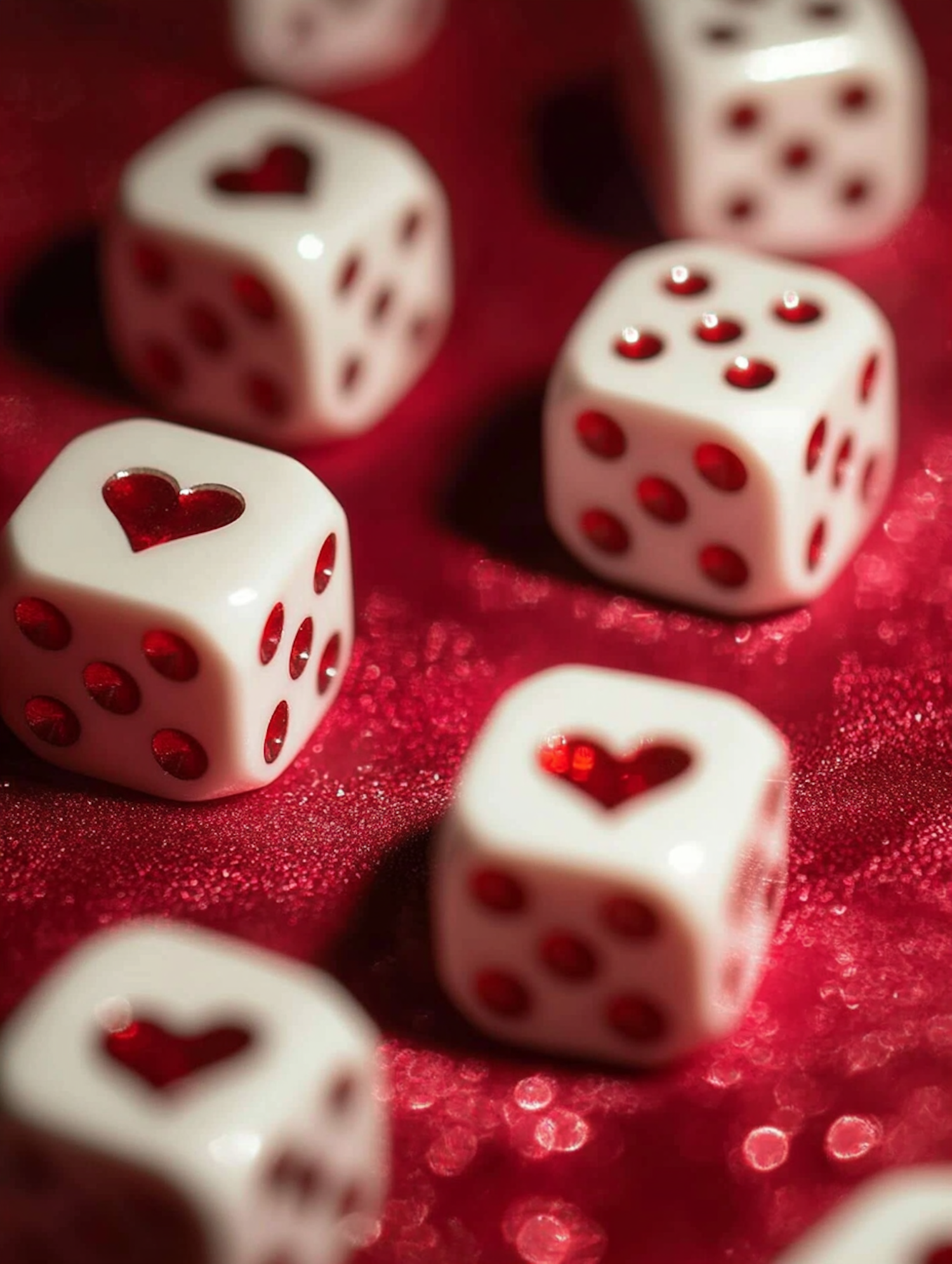 White dice with red pips and hearts on a shimmering red surface, creating a playful and romantic visual theme.