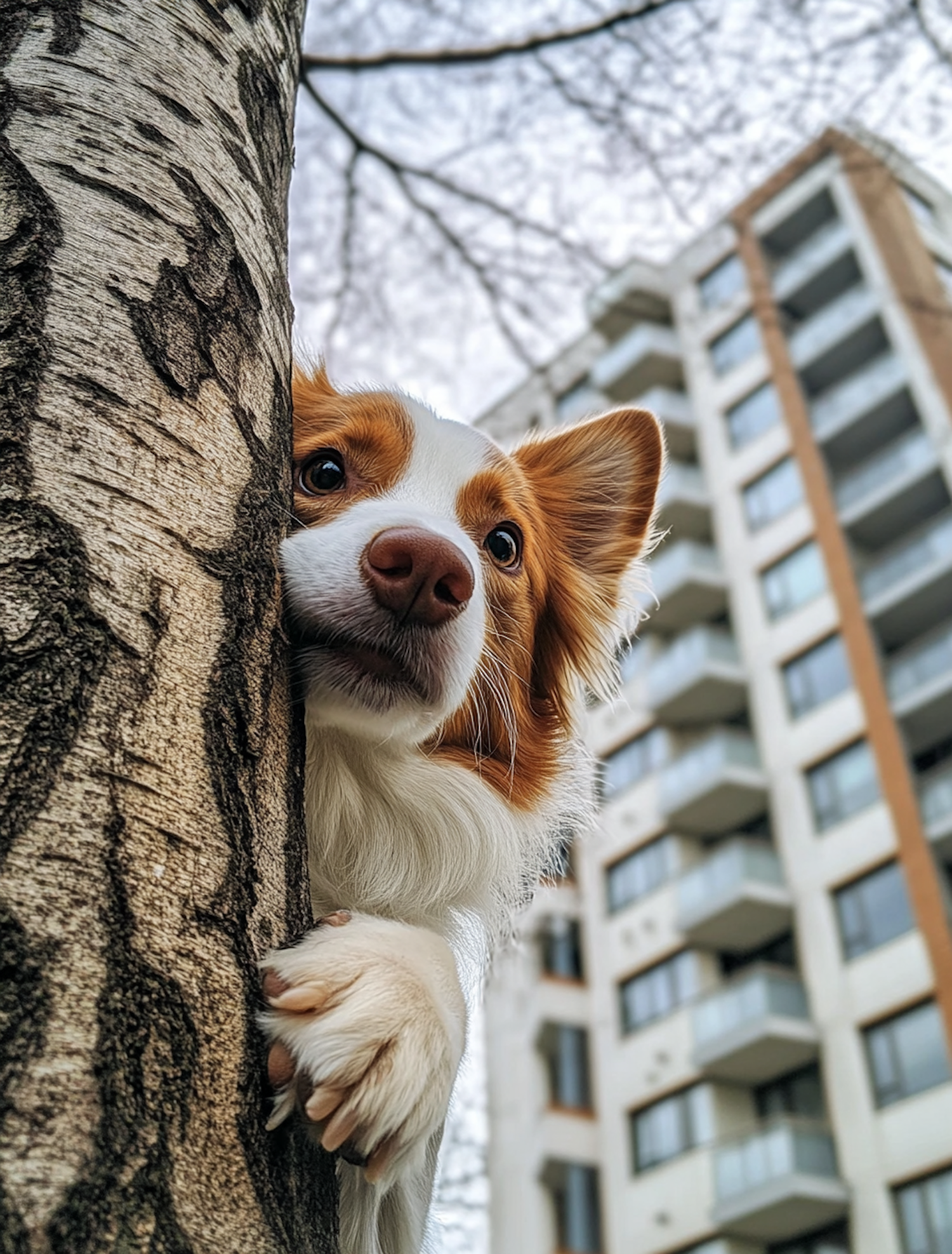 Adorable dog peeking around a tree in an urban setting with a tall building in the background. Playful and curious expression.