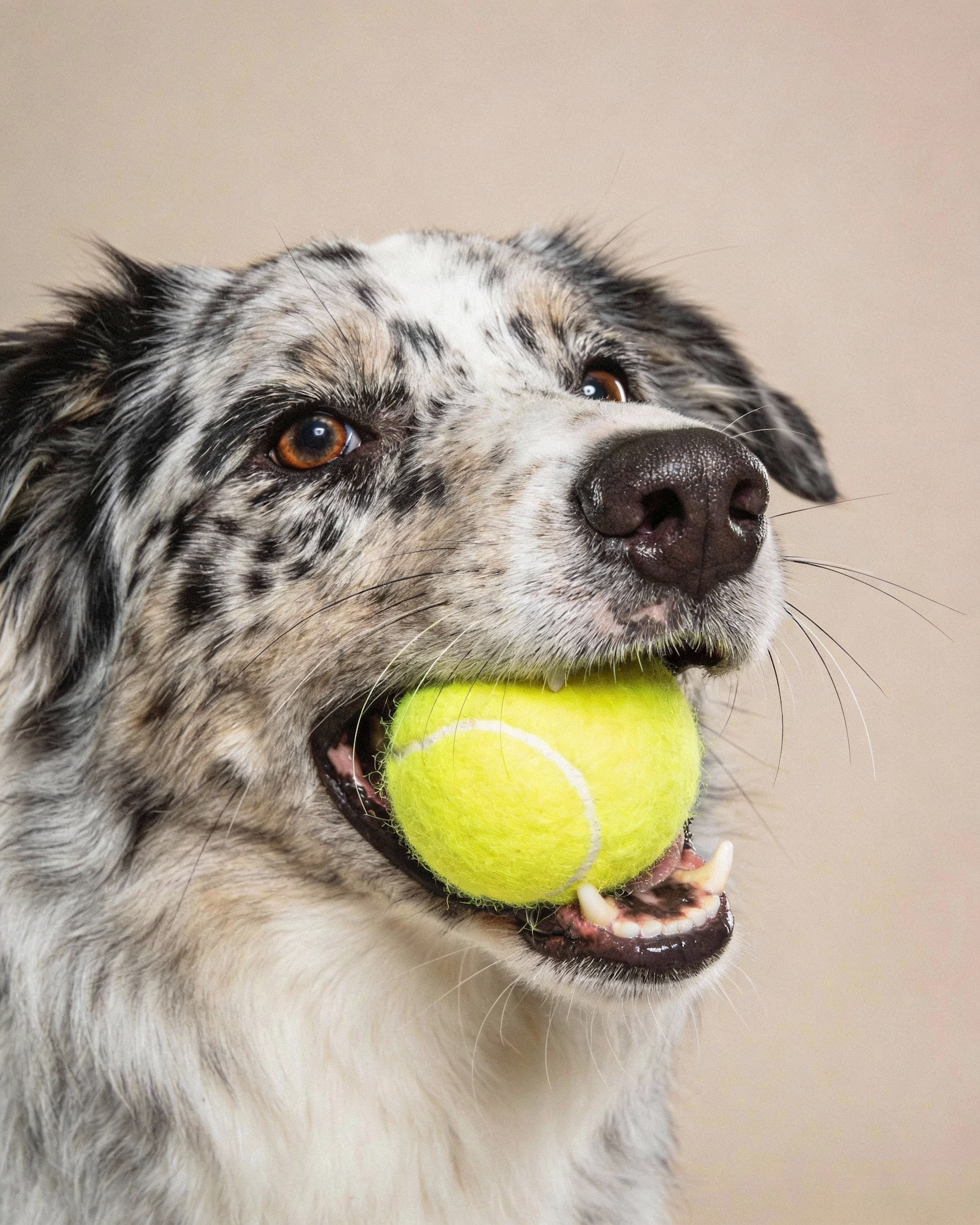 Ultra realistic studio pet photography, cold beige seamless background, clean minimal composition, soft diffused studio lighting, subtle natural shadows under the dog, high detail fur texture, visible whiskers, realistic nose texture, sharp focus on eyes, high-end commercial photography, 85mm lens look, f/4 depth of field, crisp details, no text, no logo, no collar, no props, Close-up portrait, dog holding a bright tennis ball in its mouth, mouth open slightly around the ball, playful expression, eyes looking slightly off-camera, framing cropped at neck, breed: Australian Shepherd (merle coat), high detail