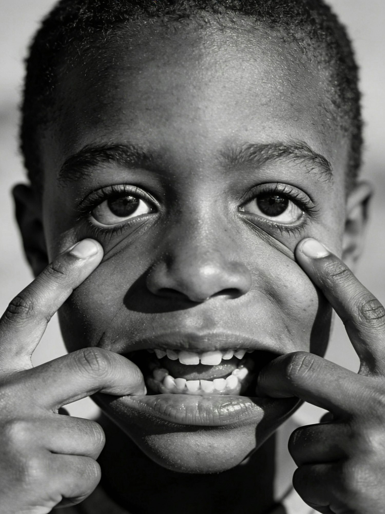 Black-and-white close-up of a child making a playful face, pulling their eyelids and mouth, with dramatic lighting emphasizing their expression.