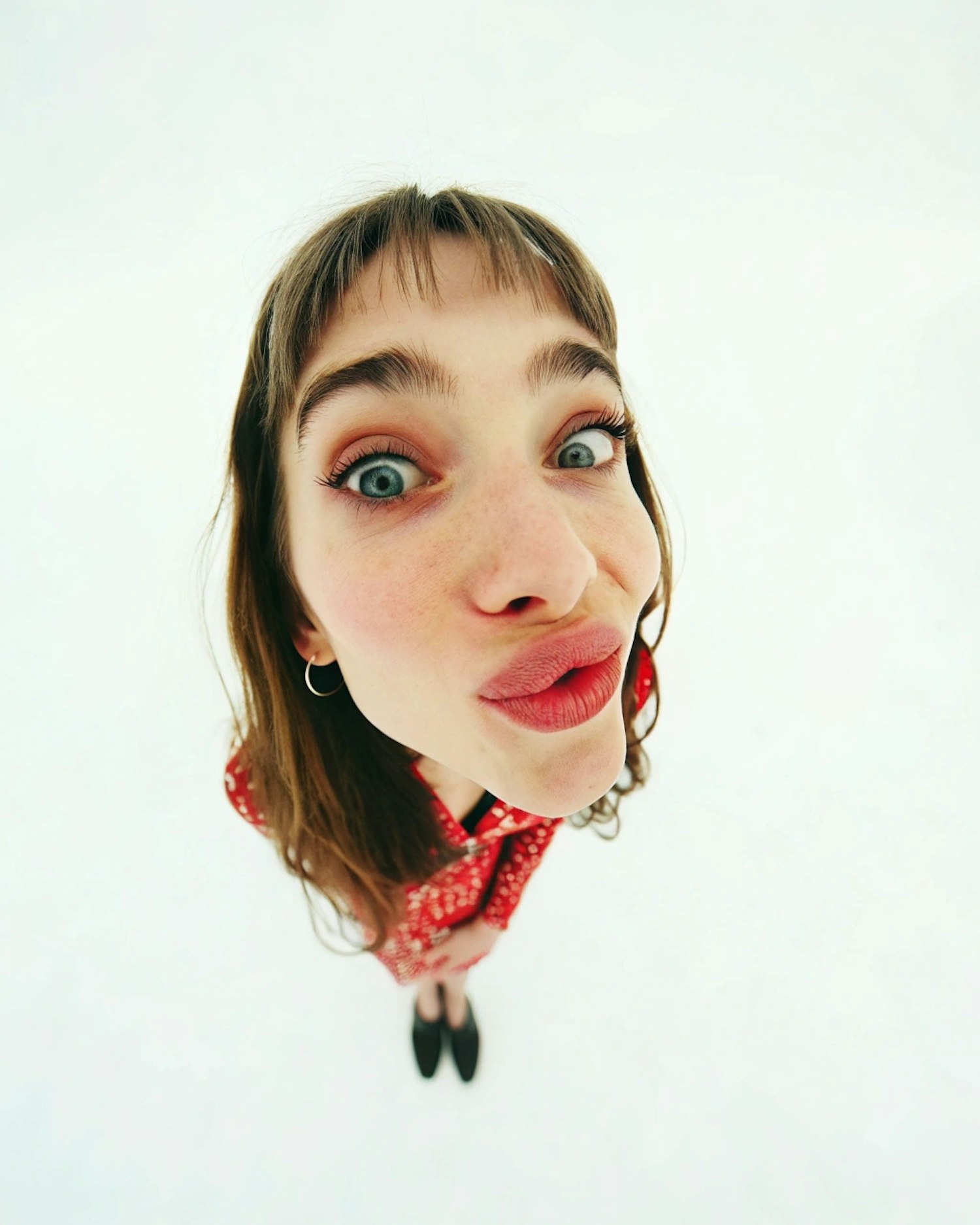 Playful fisheye portrait of a young woman in a red outfit, puckering her lips against a clean white background.