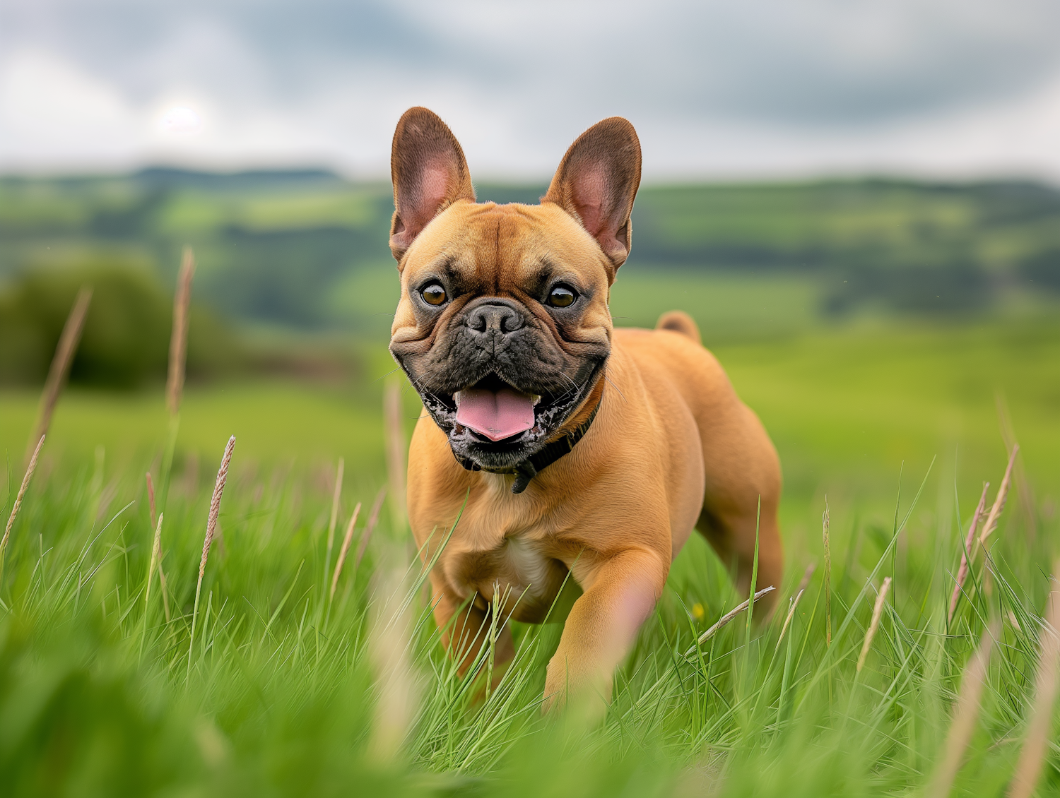 Energetic French Bulldog with fawn coat playing in a lush green field, showcasing joy and vitality against a scenic backdrop.