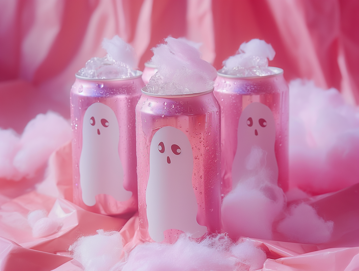 Whimsical pink soda cans with ghost illustrations, topped with cotton candy, set against a dreamy pink background.