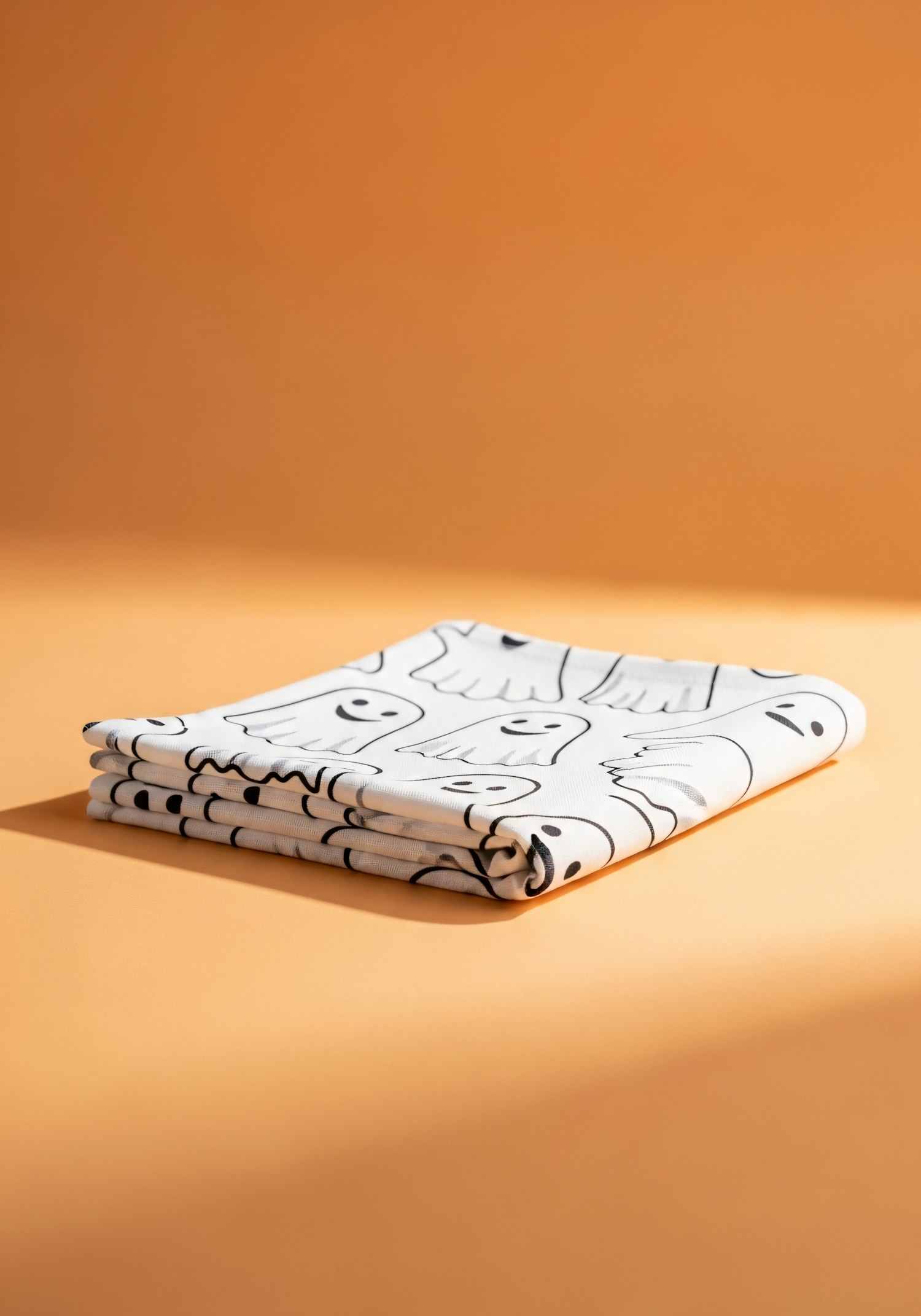 Folded white fabric with a cute ghost pattern on a warm orange background, perfect for Halloween-themed crafts or decor.