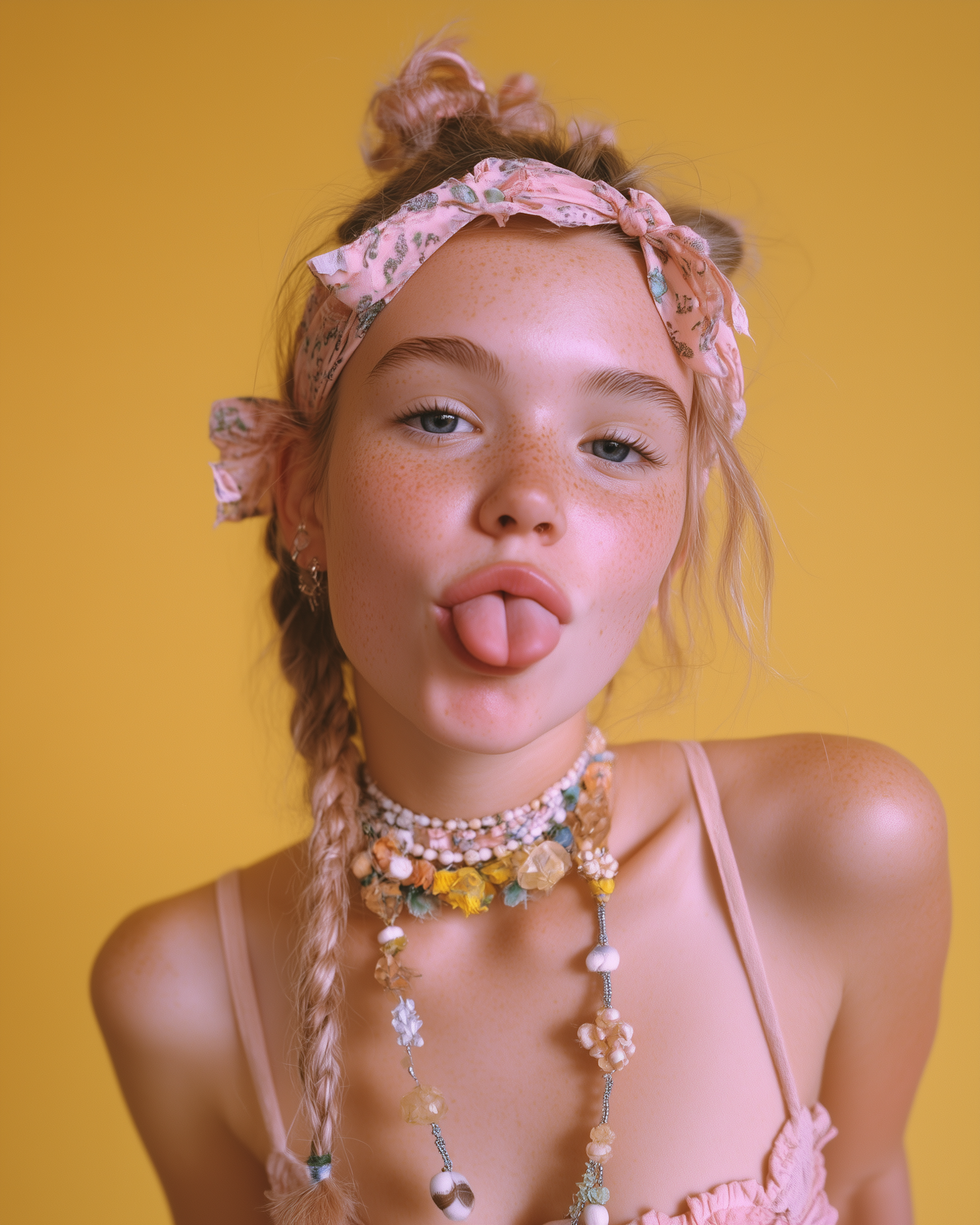 Playful girl with freckles and floral headband sticks out tongue against a vibrant yellow background, exuding youthful charm.