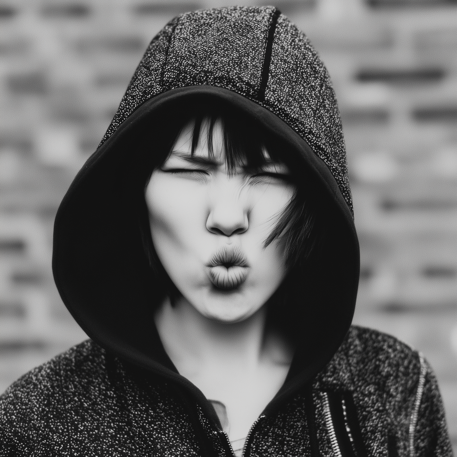 Black-and-white photo of a person in a hoodie making a playful face with pursed lips, set against a blurred brick background.