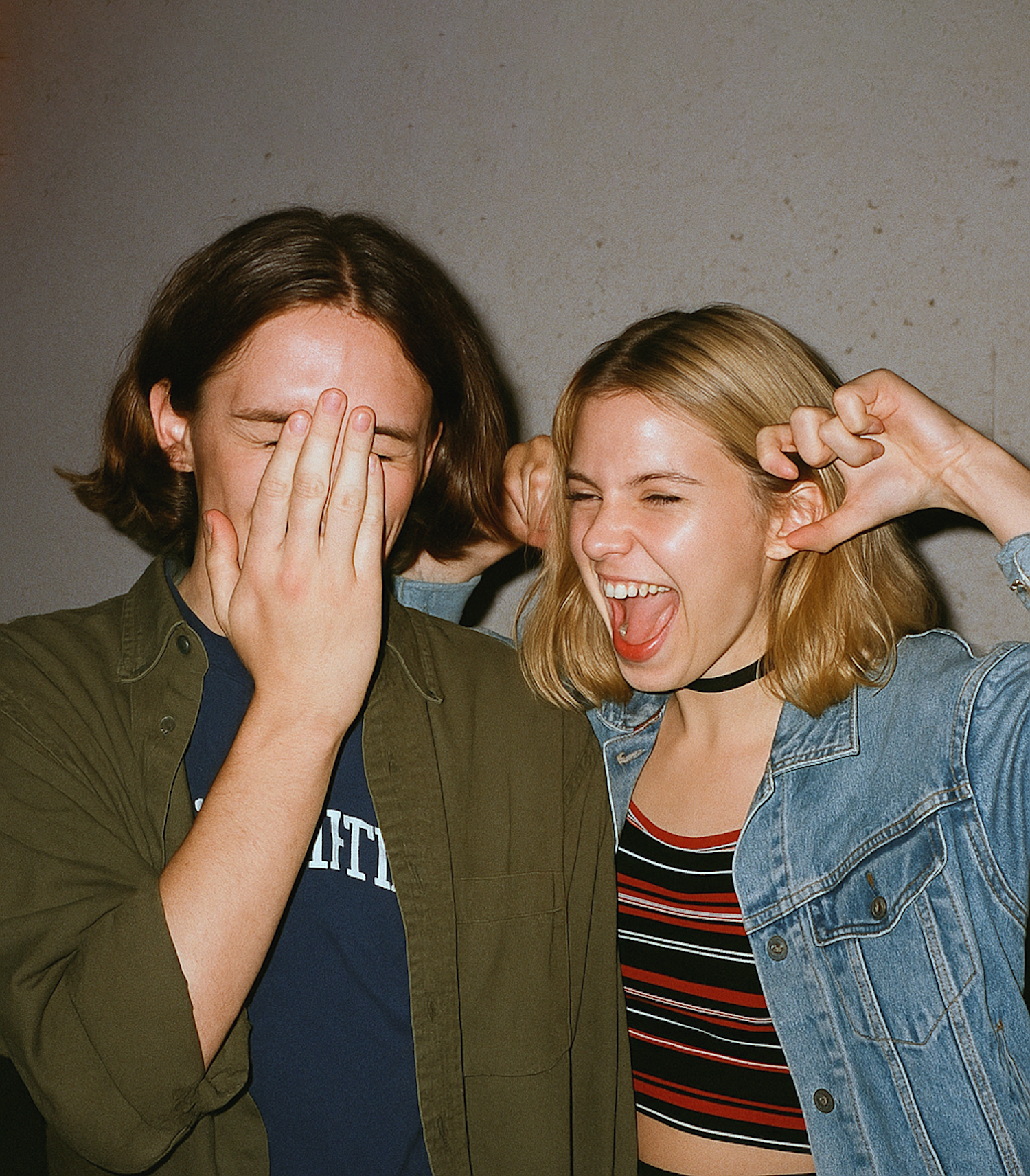 Two friends share a playful moment, one laughing while the other covers their face, creating a fun and candid vibe.