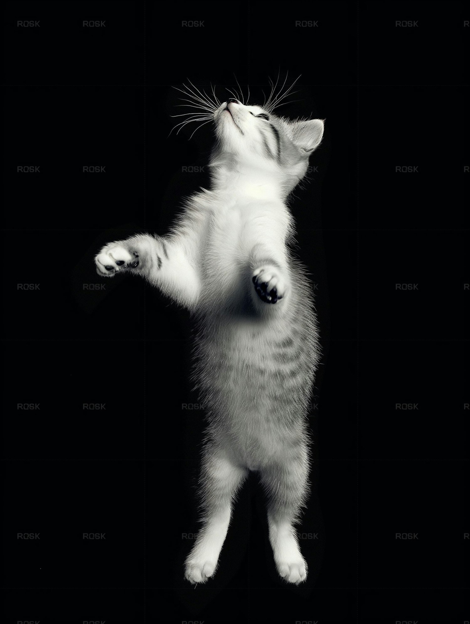 A playful kitten leaps joyfully against a black background, showcasing its agility and grace with extended paws and closed eyes.