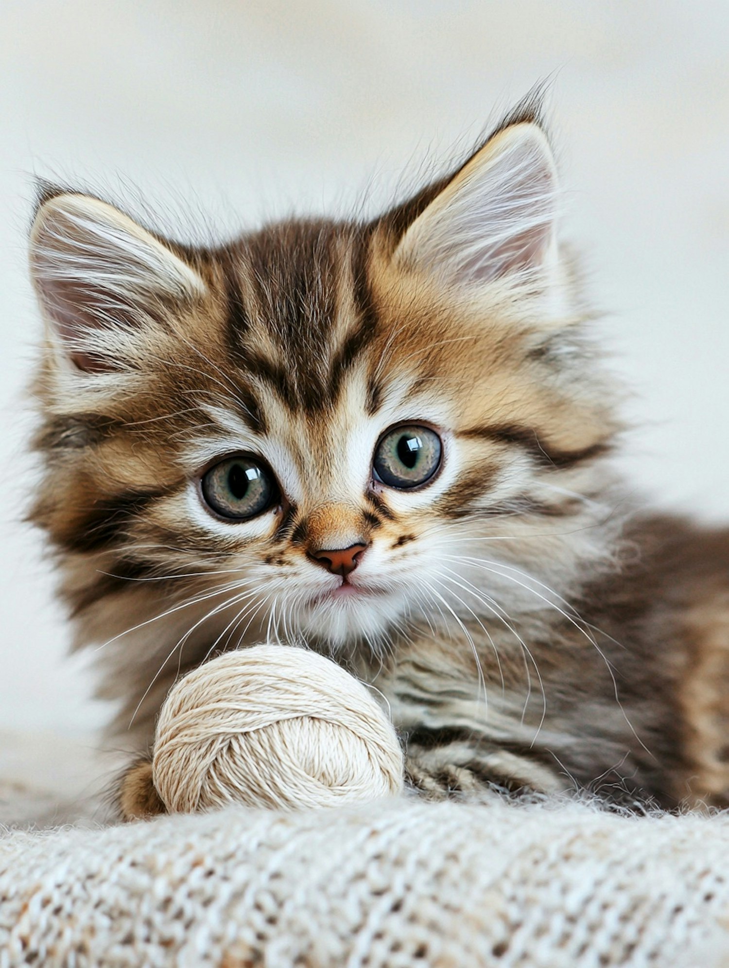 Adorable fluffy kitten with green eyes playing with a beige yarn ball on a soft knitted surface. Perfect cozy and heartwarming moment.