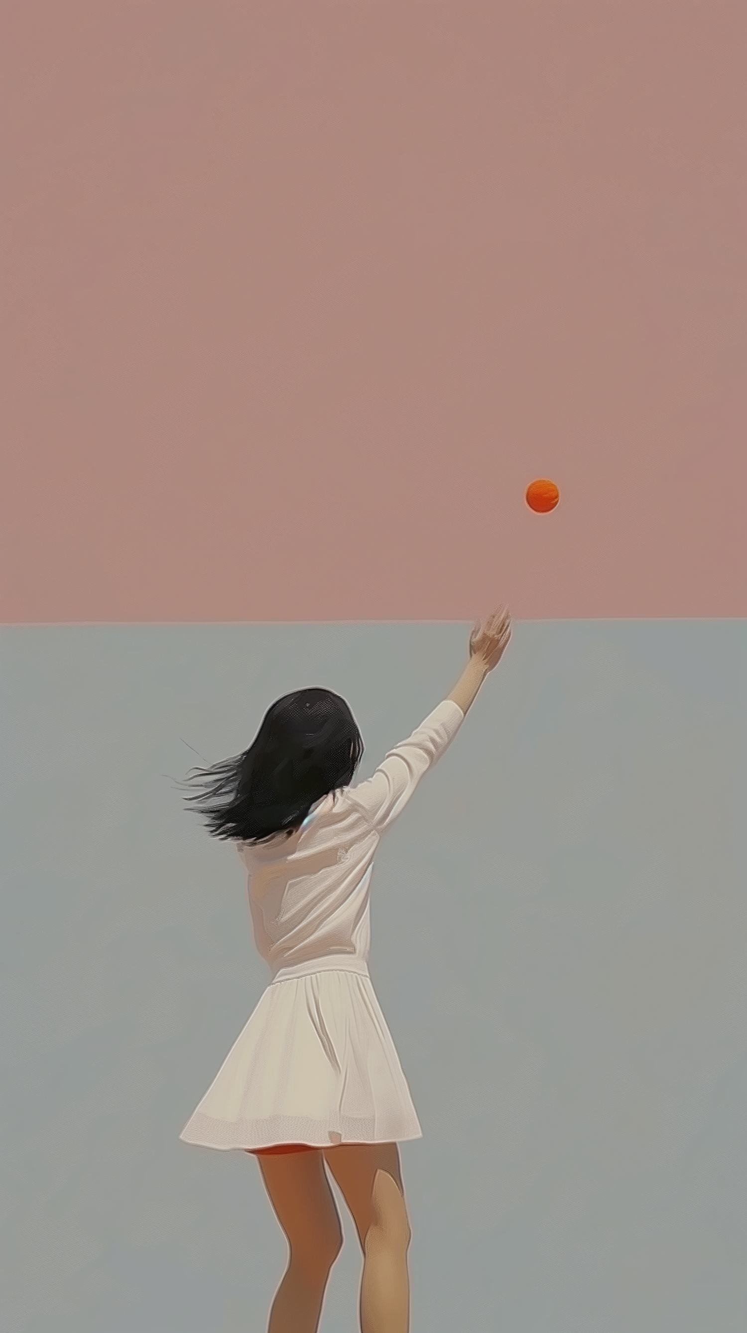 Woman in white dress reaching for an orange ball against a pink and blue minimalist background.