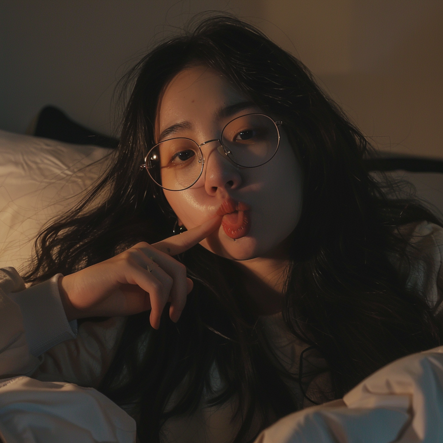 Asian woman with glasses playfully pouting on a bed, warm lighting creates a cozy atmosphere.