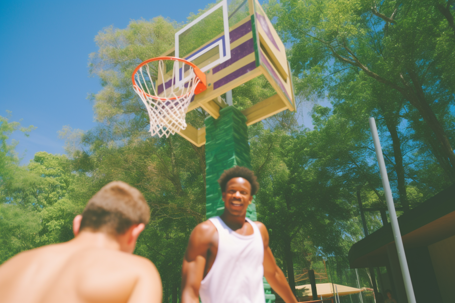 Two young men playing basketball outdoors, one smiling at the camera. Vibrant scene with lush trees and a unique basketball hoop.