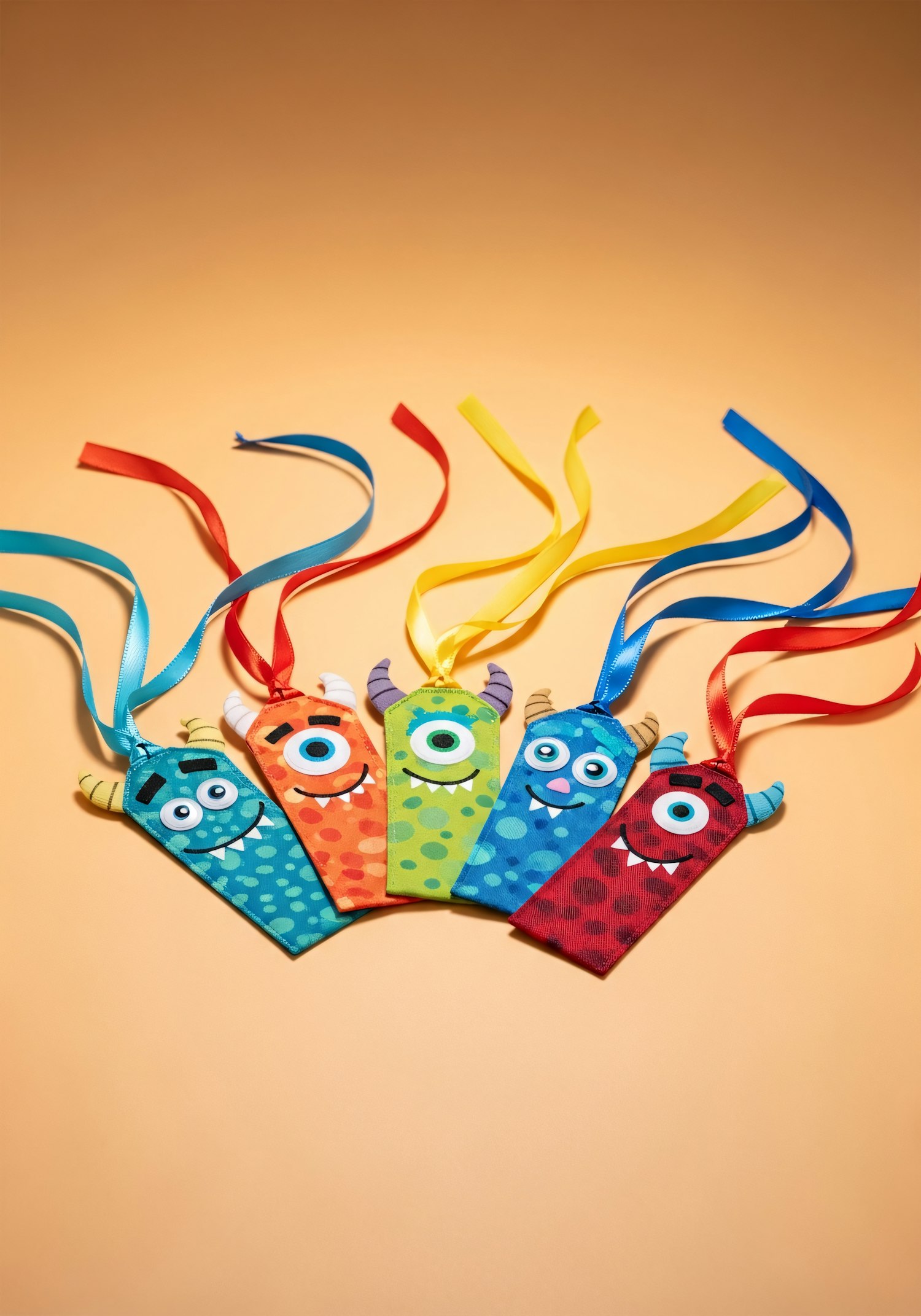 Colorful monster-themed bookmarks with ribbons, perfect for kids and fun reading moments.