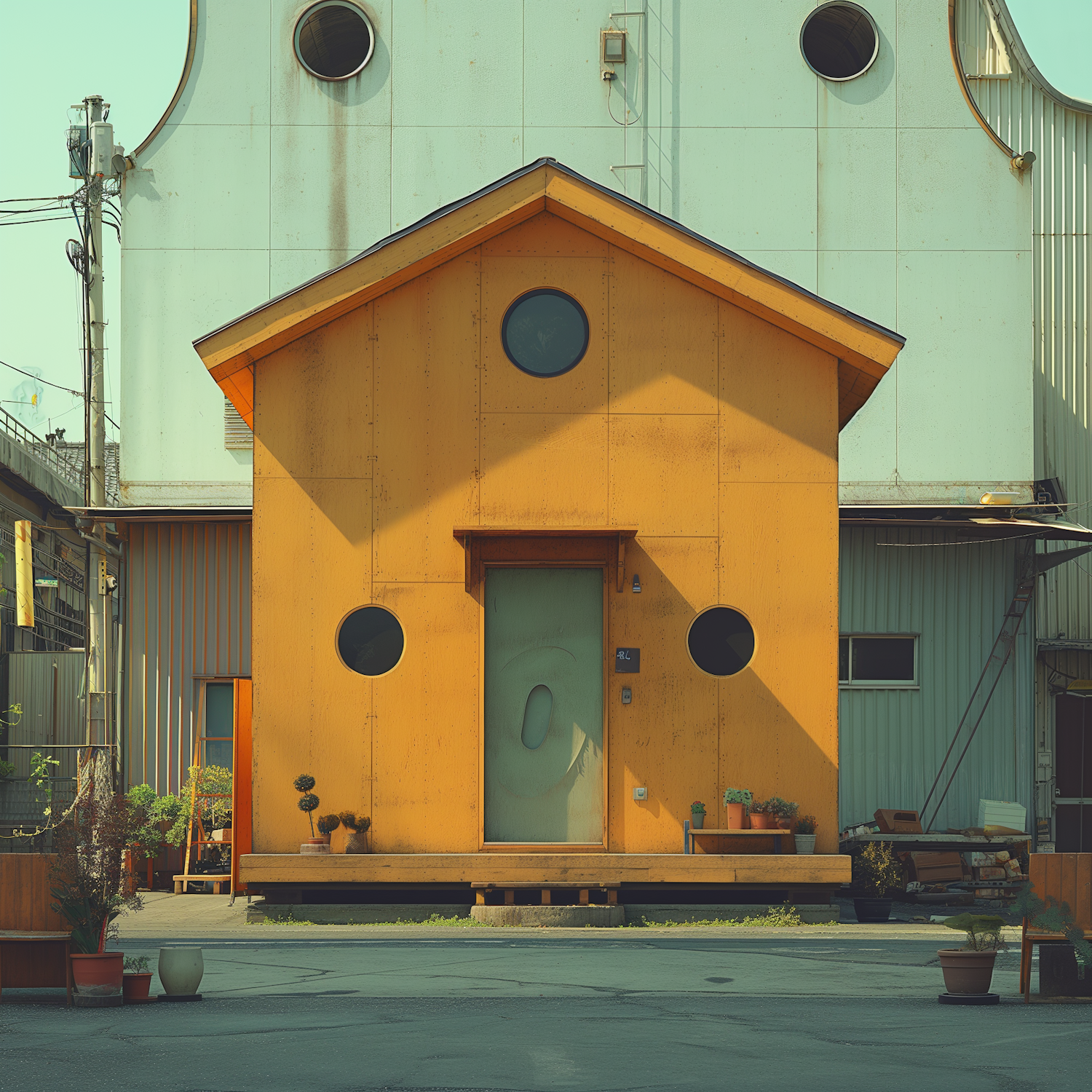 Vibrant yellow house with circular windows and green door, set against an industrial backdrop. Unique design with potted plants.