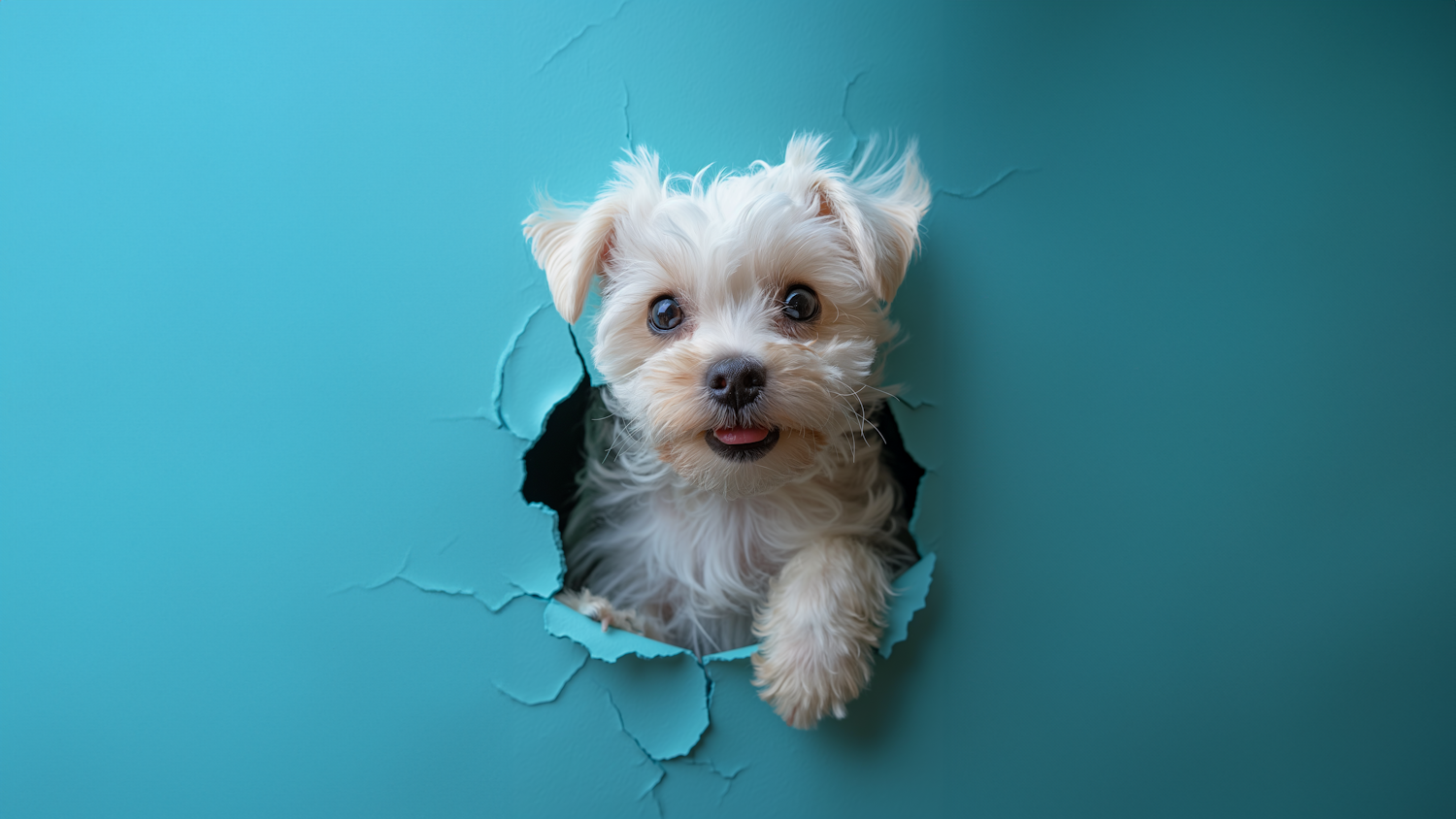 Adorable white puppy peeking through a torn turquoise background, showcasing its fluffy fur and playful expression.