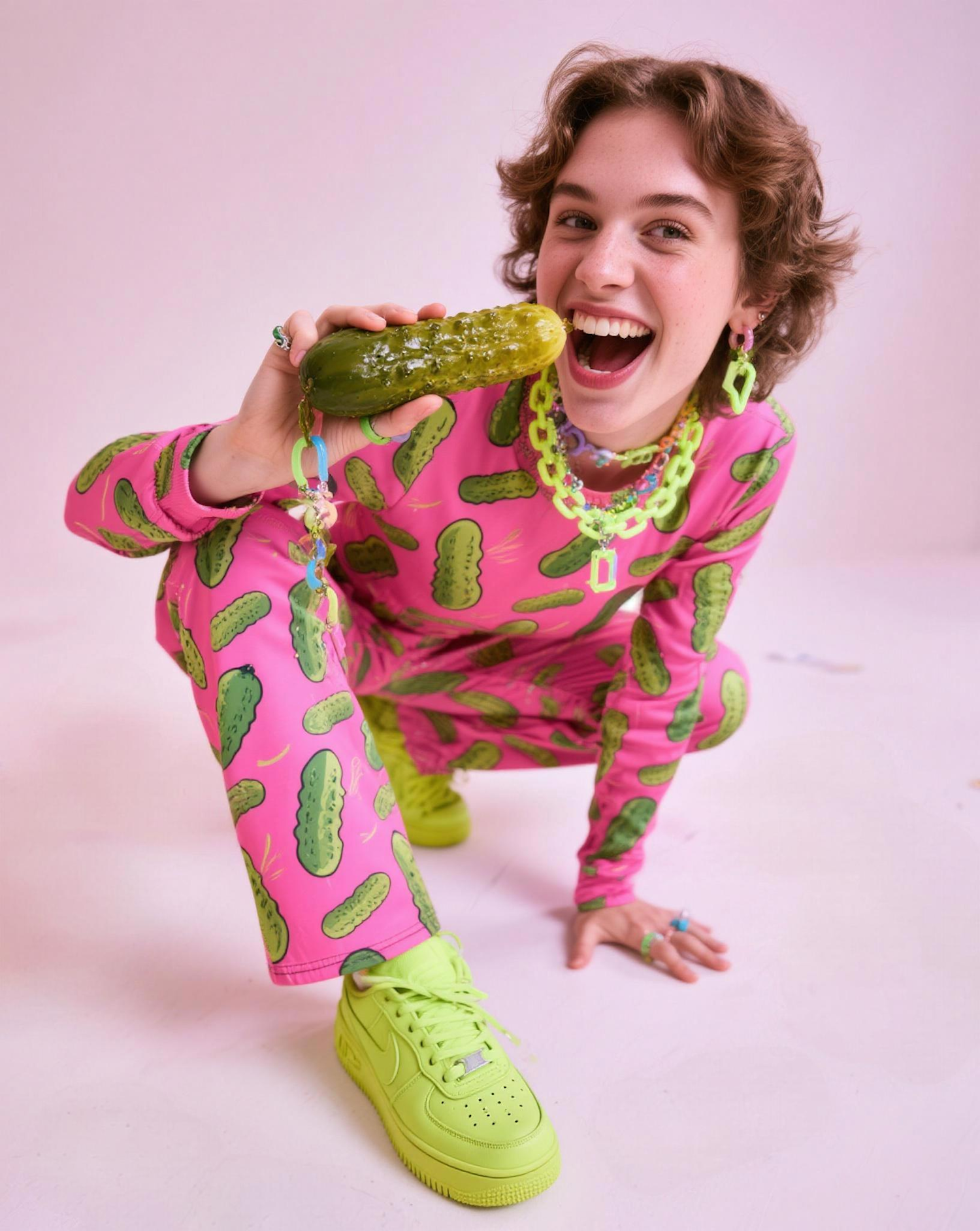 A cheerful person in a pink pickle-patterned outfit and neon green sneakers poses with a pickle against a pink backdrop.