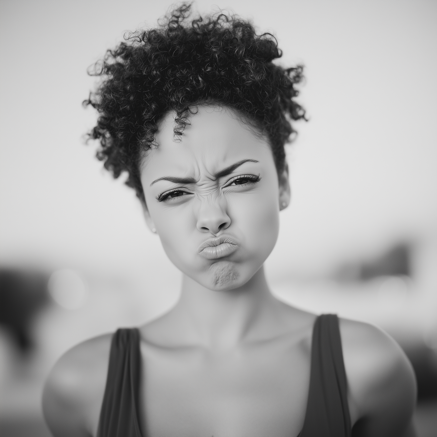 Black and white portrait of a woman with curly hair making a playful expression, set against a softly blurred background.