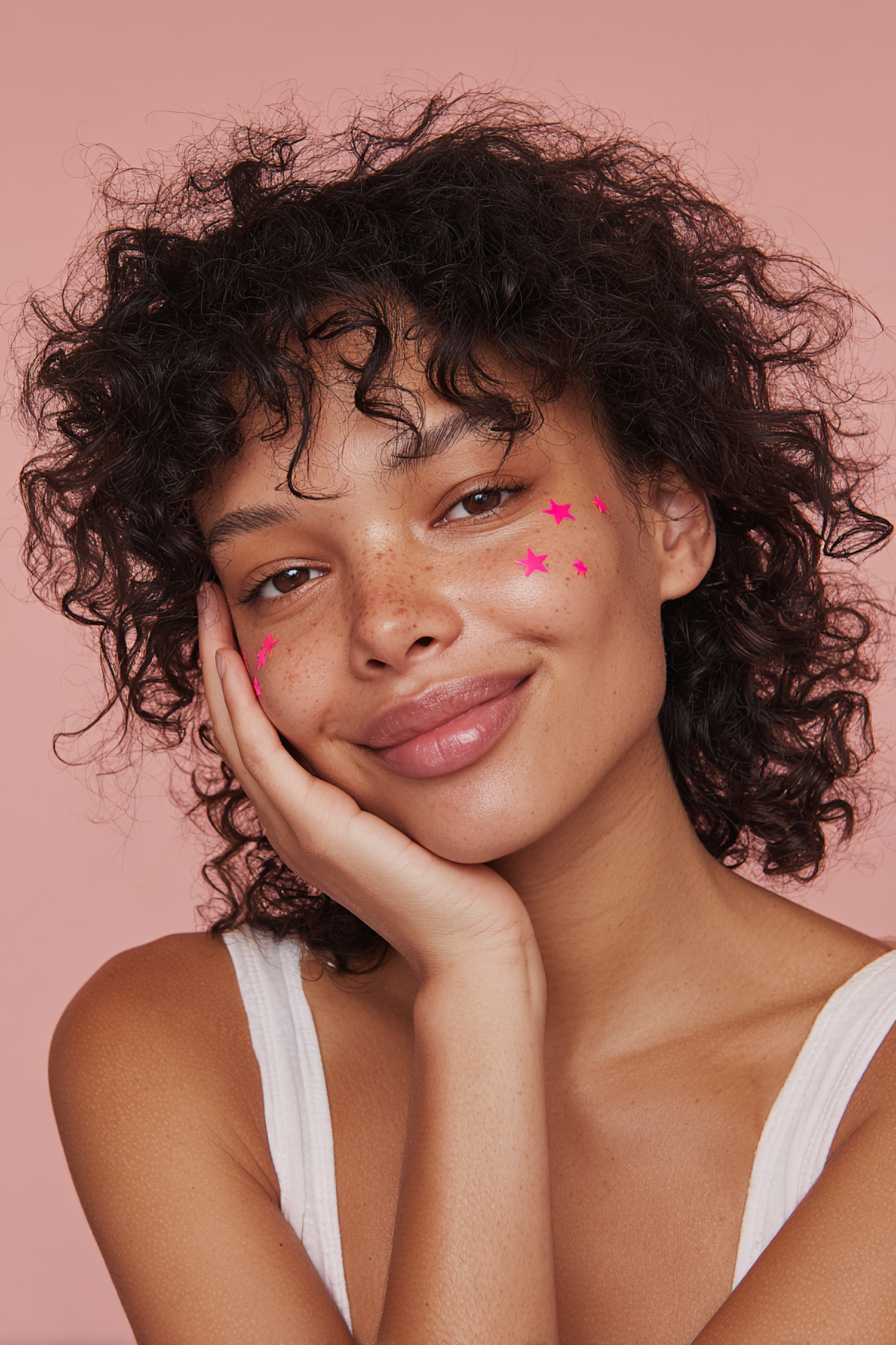A young woman with curly hair, freckles, and pink star stickers on her cheeks smiles warmly against a soft pink background.