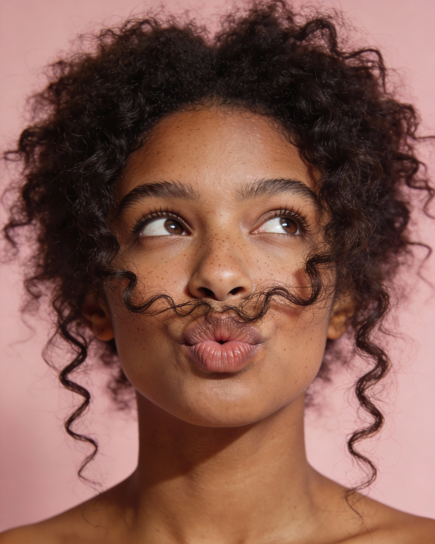 Ultra realistic close-up portrait photography, high-end natural beauty campaign, clean minimal composition, seamless solid pastel pink studio background. Very tight framing, face filling most of the frame, forehead and hair visible, chin slightly cropped. Model with deep dark brown complexion, warm undertone, natural skin texture with visible pores and subtle freckles, realistic skin imperfections, no heavy retouching, no plastic skin. Expression: lips gently puckered as if blowing a kiss (kissy face), cheeks relaxed, playful thoughtful mood. Eyes open and looking up to the right (gaze off camera), soft curious expression. Hair: natural afro textured hair, big voluminous curls/coils, airy soft texture, lots of movement, a few thick curly strands falling across the face and mouth area (same messy placement as reference), realistic curl definition, natural hairline. Lighting: soft diffused daylight / studio natural light, gentle highlights on skin, minimal shadows, crisp sharp focus, editorial portrait look, 85mm lens, f/2.8, high resolution.