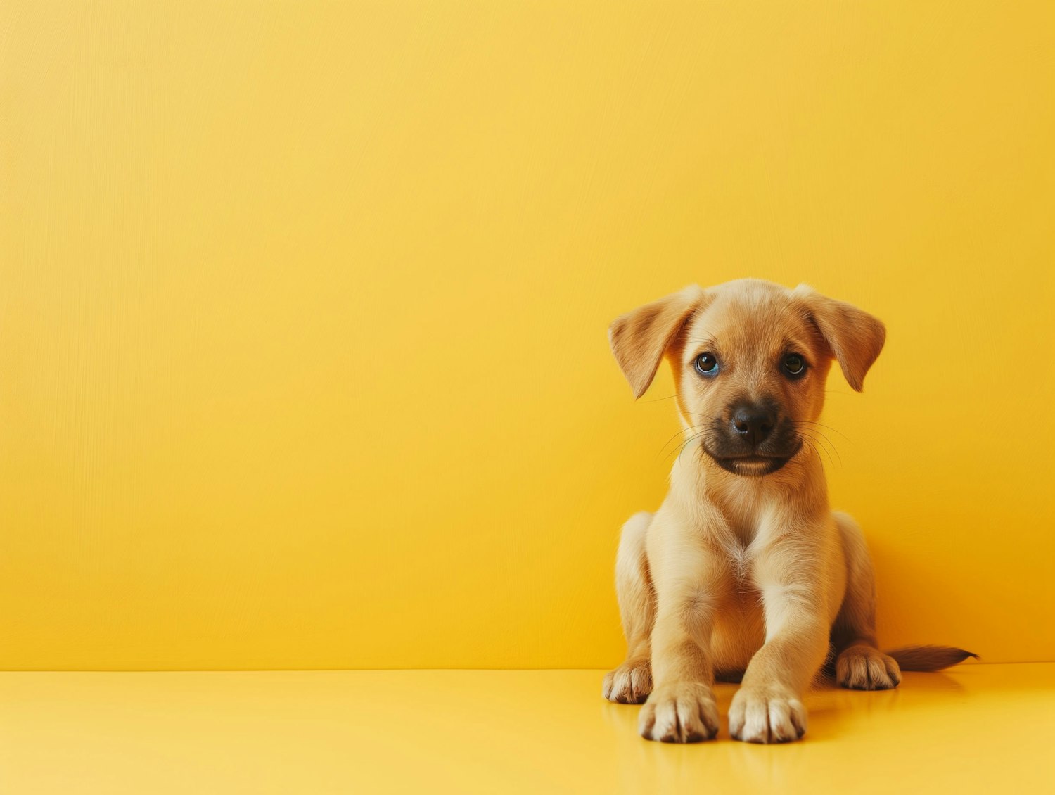 Adorable light brown puppy sitting against a vibrant yellow background, showcasing its cute and curious expression.