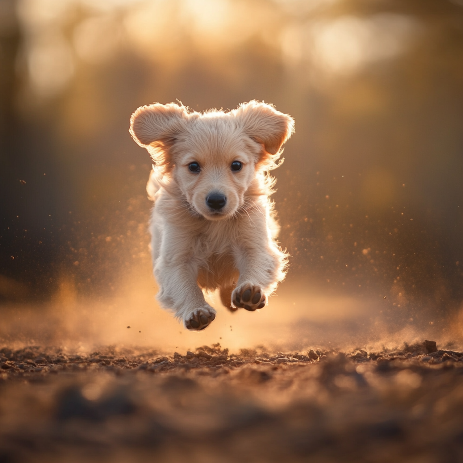 Adorable golden retriever puppy running joyfully, captured mid-air with a warm, glowing background. Perfect for pet lovers.