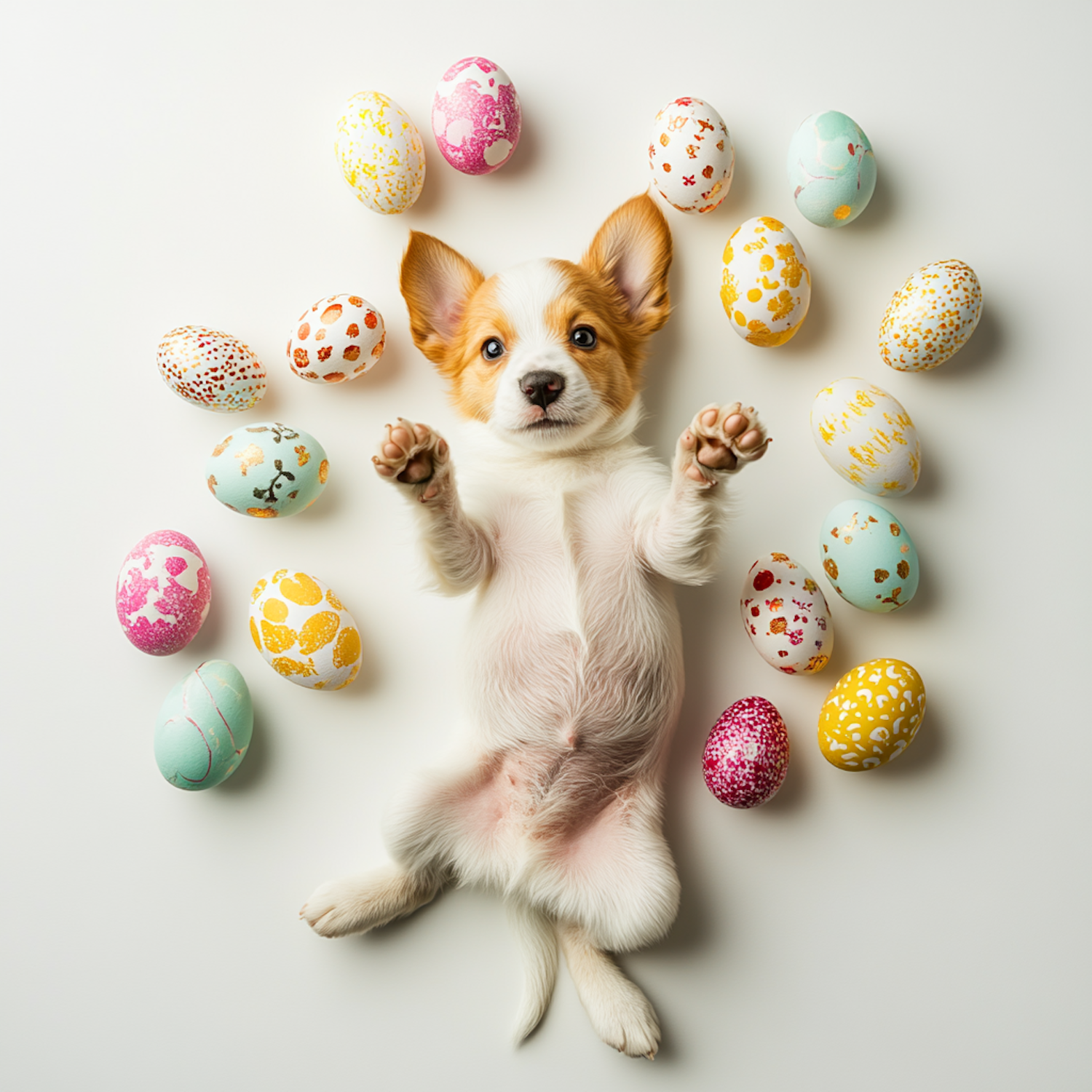 Adorable puppy lying on its back surrounded by colorful, decorated Easter eggs, creating a festive and cheerful vibe.